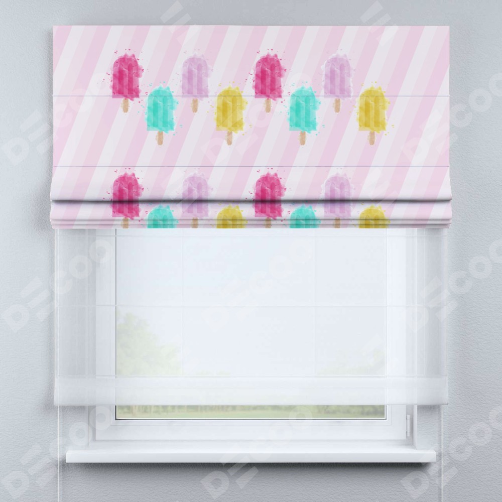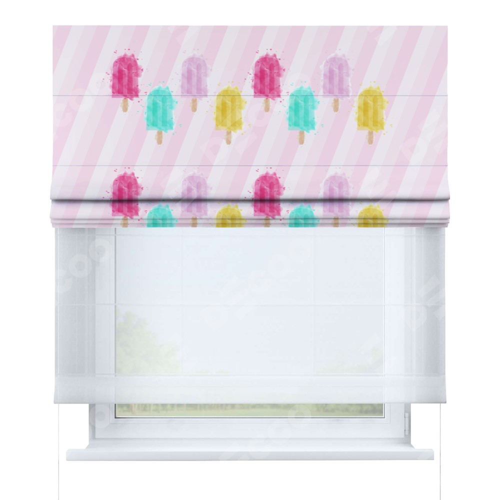 Римская штора день-ночь производителя «Cortin», используется для проёма, пошита из двух полотен, с лицевой блэкаут с нанесением сублимационной печати «Фруктовое мороженое», вторая ткань тюль (по стандарту комплектуется тюль белого цвета артикул V-01). Имеет универсальный механизм и подходит для монтажа: на потолок, на стену и в нишу.