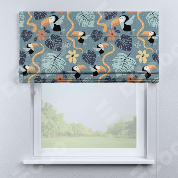 Римская штора производителя «Cortin», используется для проёма, пошита из ткани блэкаут с нанесением сублимационной печати «Экзотические птицы». Имеет универсальный механизм и подходит для монтажа: на потолок, на стену и в нишу.