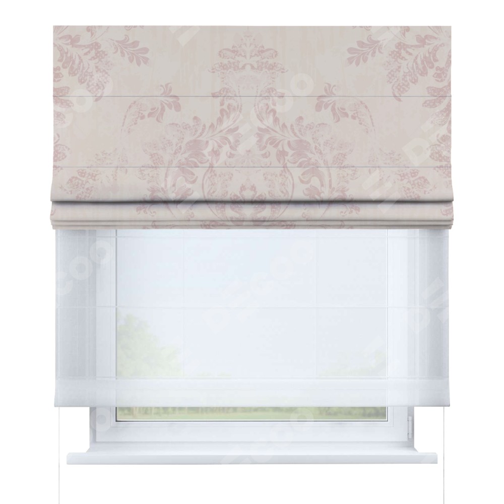 Римская штора день-ночь производителя «Cortin», используется для проёма, пошита из двух полотен, с лицевой блэкаут с нанесением сублимационной печати «Винтажный узор пудровый», вторая ткань тюль (по стандарту комплектуется тюль белого цвета артикул V-01). Имеет универсальный механизм и подходит для монтажа: на потолок, на стену и в нишу.