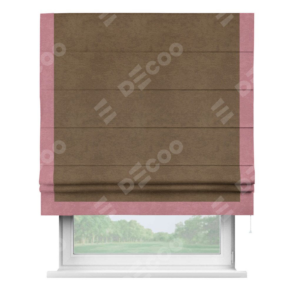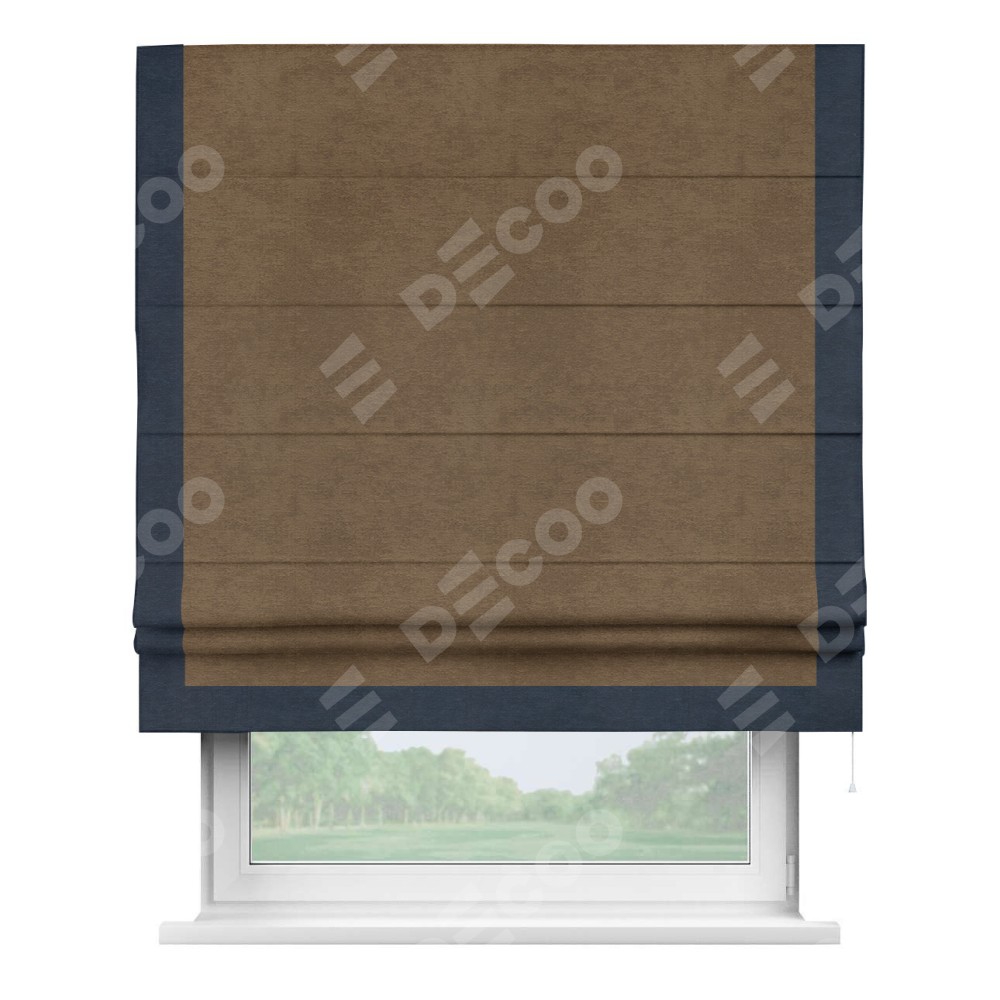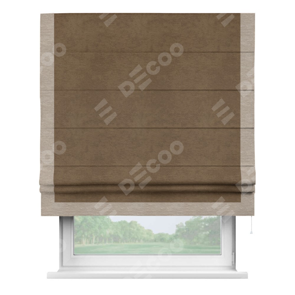 Римская штора производителя «Cortin», используется для проёма, пошита из ткани софт однотонный бронзовый, артикул 33099. Отделка шторы кантом «Виктория», ткань для канта используется из софта разной расцветки на выбор. Имеет универсальный механизм и подходит для монтажа: на потолок, на стену и в нишу.