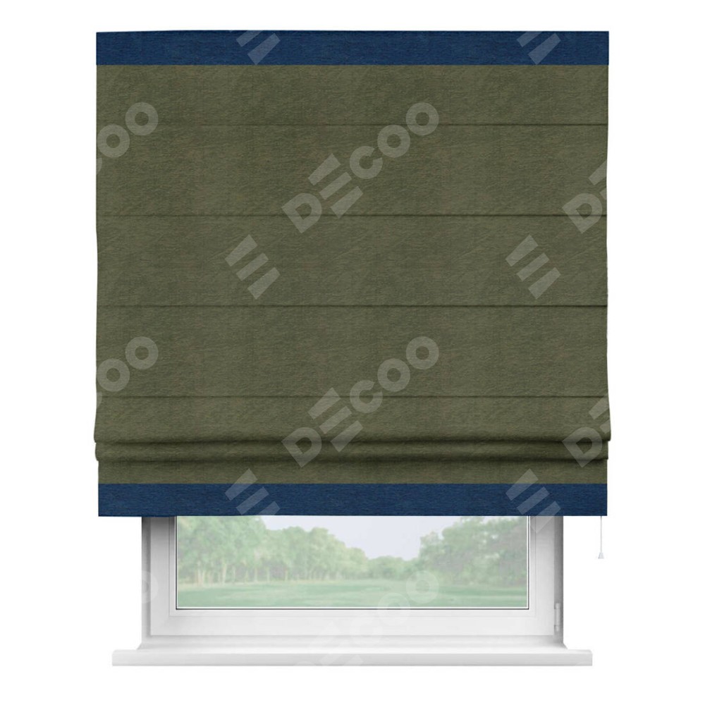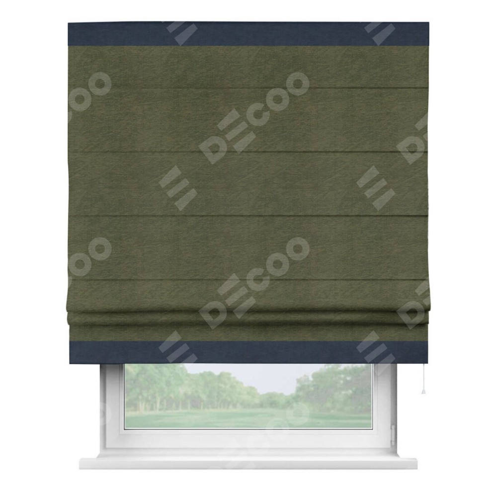 Римская штора производителя «Cortin», используется для проёма, пошита из ткани софт однотонный зелёный, артикул 33110. Отделка шторы кантом «Горизонт», ткань для канта используется из софта разной расцветки на выбор. Имеет универсальный механизм и подходит для монтажа: на потолок, на стену и в нишу.