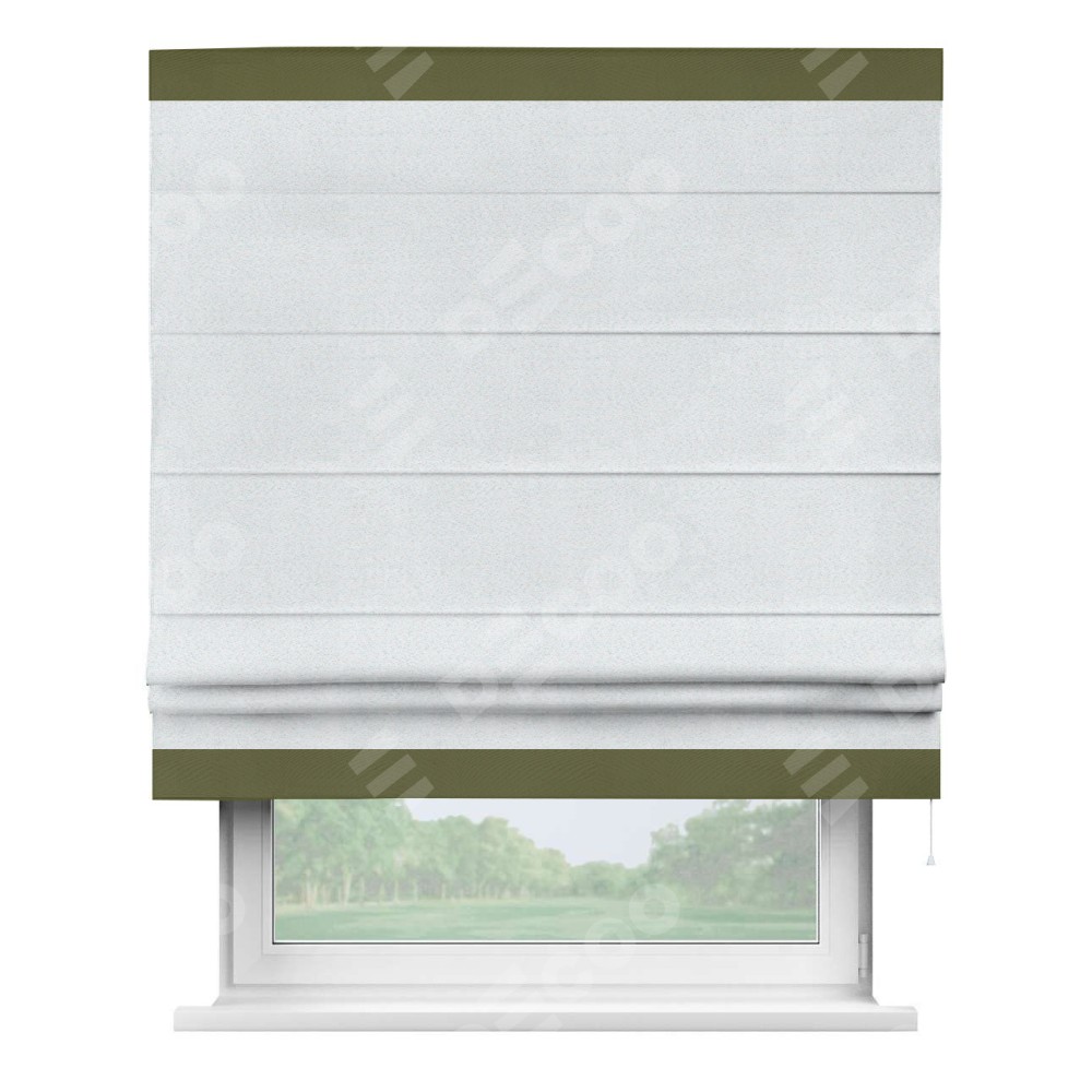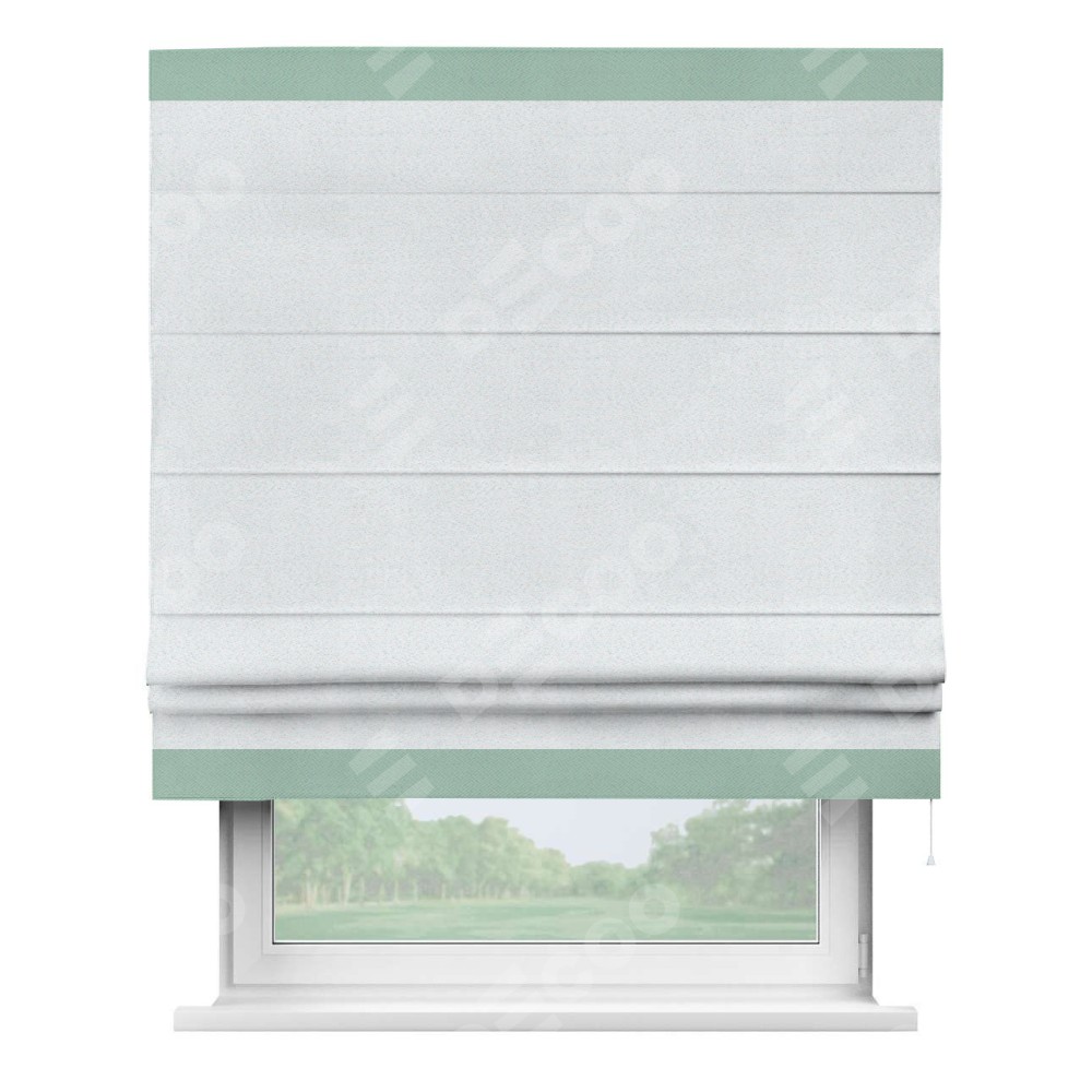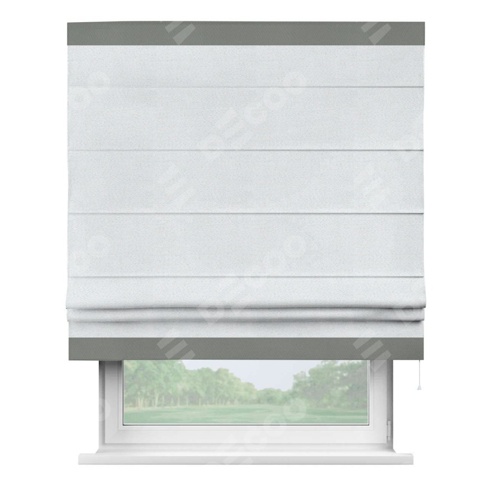 Римская штора производителя «Cortin», используется для проёма, пошита из ткани блэкаут однотонный дымчато-белый, артикул ткани 101. Отделка шторы кантом «Горизонт», ткань для канта используется из блэкаута однотонного разной расцветки на выбор. Имеет универсальный механизм и подходит для монтажа: на потолок, на стену и в нишу.