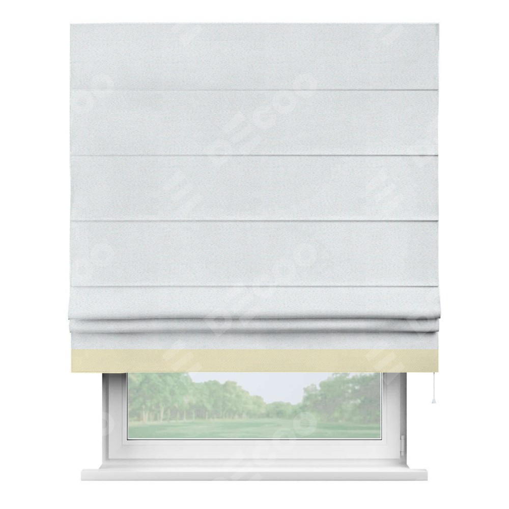 Римская штора производителя «Cortin», используется для проёма, пошита из ткани блэкаут однотонный дымчато-белый, артикул ткани 101. Отделка шторы кантом «Джестер», ткань для канта используется из блэкаута однотонного разной расцветки на выбор. Имеет универсальный механизм и подходит для монтажа: на потолок, на стену и в нишу.