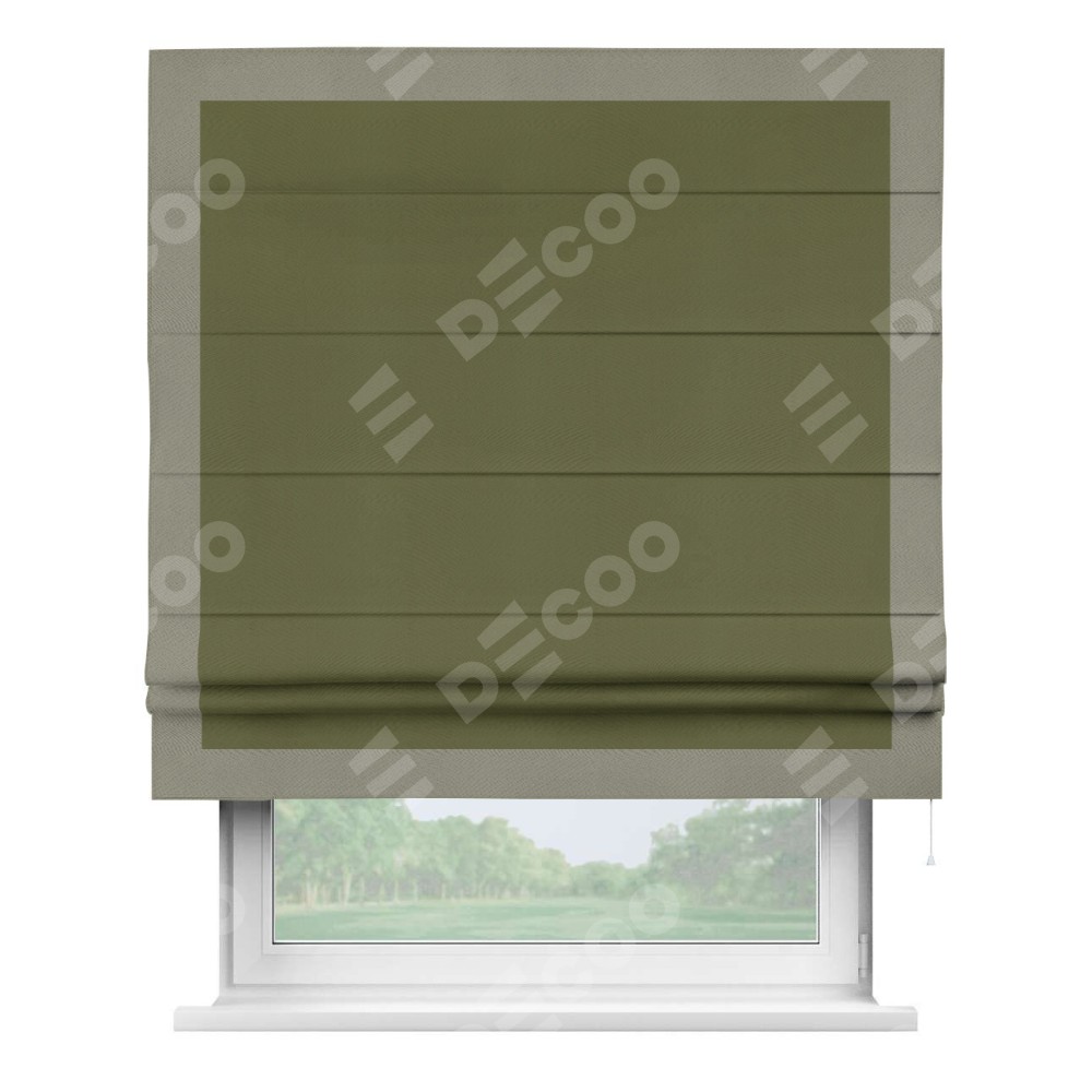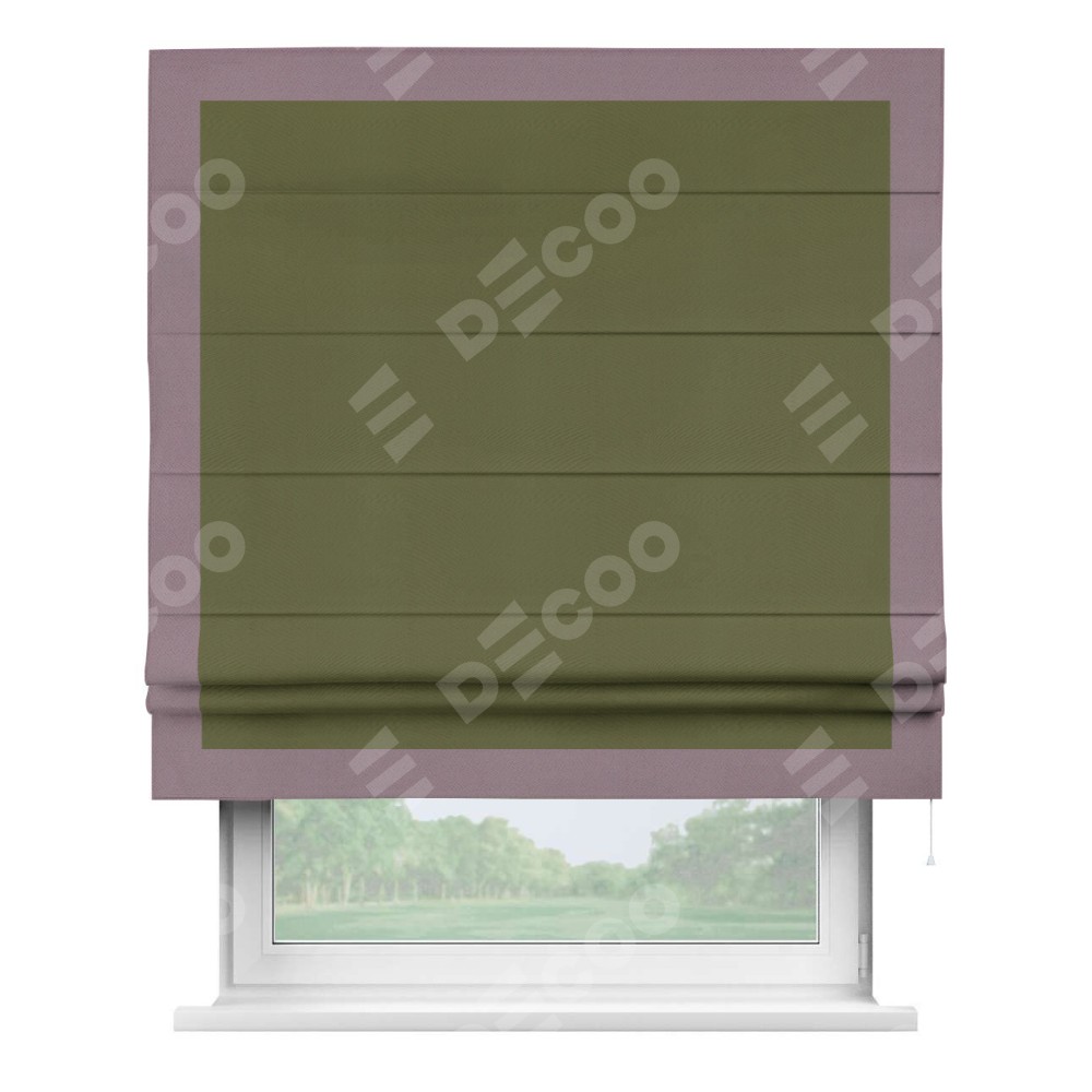 Римская штора производителя «Cortin», используется для проёма, пошита из ткани блэкаут однотонный зелёный, артикул ткани 81859. Отделка шторы кантом «Чесс», ткань для канта используется из блэкаута однотонного разной расцветки на выбор. Имеет универсальный механизм и подходит для монтажа: на потолок, на стену и в нишу.