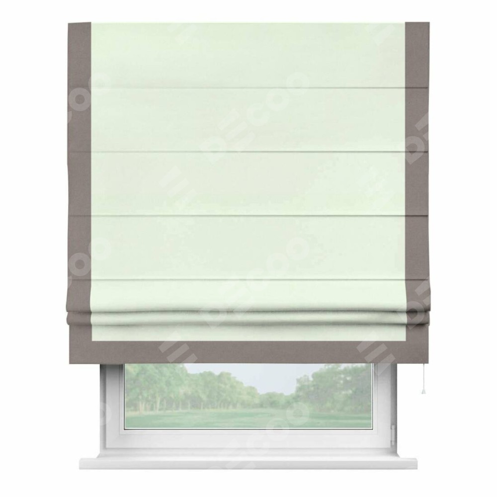 Римская штора производителя «Cortin», используется для проёма, пошита из ткани вельвет кремовый, артикул ткани 85524. Отделка шторы кантом «Виктория», ткань для канта используется из вельвета разной расцветки на выбор. Имеет универсальный механизм и подходит для монтажа: на потолок, на стену и в нишу.