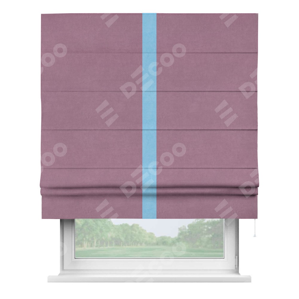 Римская штора производителя «Cortin», используется для проёма, пошита из ткани вельвет лиловый, артикул ткани 17752. Отделка шторы кантом «Хайвей», ткань для канта используется из вельвета разной расцветки на выбор. Имеет универсальный механизм и подходит для монтажа: на потолок, на стену и в нишу.