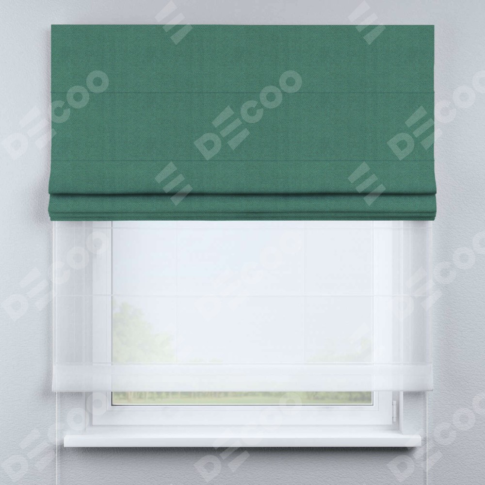 Римская штора день-ночь производителя «Cortin», используется для проёма, пошита из двух полотен, с лицевой стороны блэкаут тиснение с блеском изумрудный артикул 34628, вторая ткань тюль (по стандарту комплектуется тюль белого цвета артикул V-01). Изнаночная сторона основного материала черного цвета, что обеспечивает необходимую светонепроницаемость. Имеет универсальный механизм и подходит для монтажа: на потолок, на стену и в нишу.