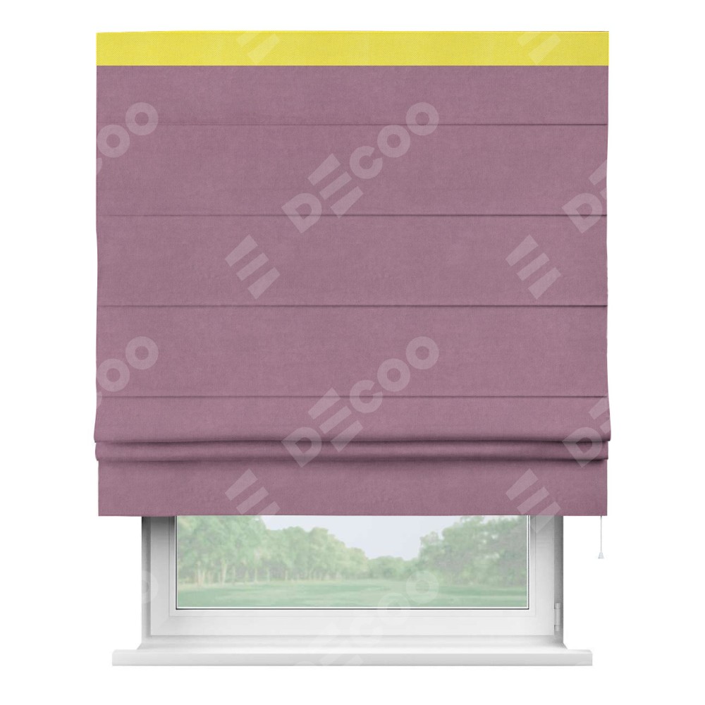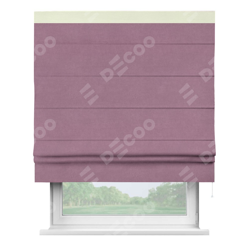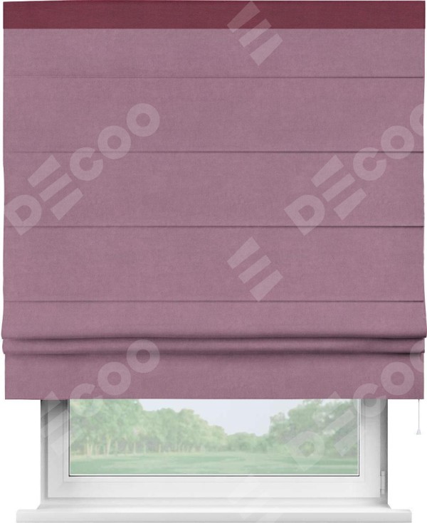 Римская штора производителя «Cortin», используется для проёма, пошита из ткани вельвет лиловый, артикул ткани 17752. Отделка шторы кантом «Кинг», ткань для канта используется из вельвета разной расцветки на выбор. Имеет универсальный механизм и подходит для монтажа: на потолок, на стену и в нишу.