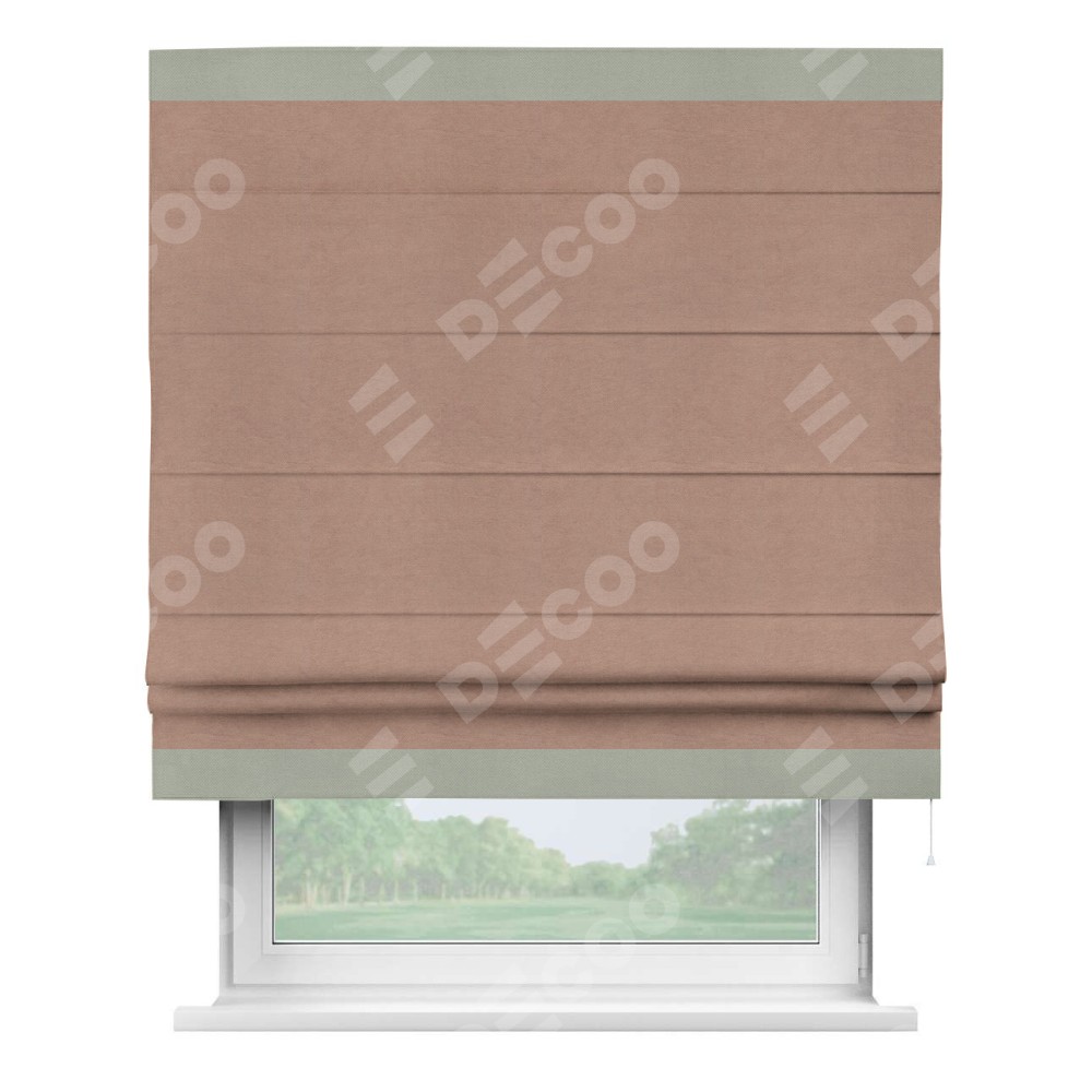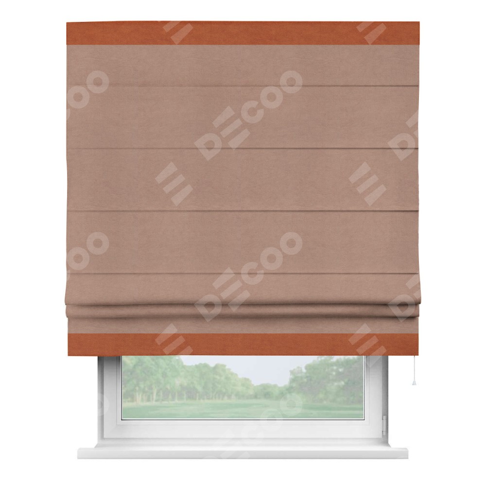 Римская штора производителя «Cortin», используется для проёма, пошита из ткани вельвет брусничный джем, артикул ткани 17750. Отделка шторы кантом «Горизонт», ткань для канта используется из вельвета разной расцветки на выбор. Имеет универсальный механизм и подходит для монтажа: на потолок, на стену и в нишу.