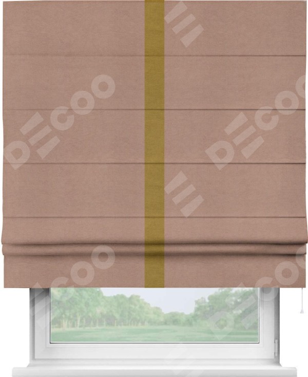 Римская штора производителя «Cortin», используется для проёма, пошита из ткани вельвет брусничный джем, артикул ткани 17750. Отделка шторы кантом «Хайвей», ткань для канта используется из вельвета разной расцветки на выбор. Имеет универсальный механизм и подходит для монтажа: на потолок, на стену и в нишу.