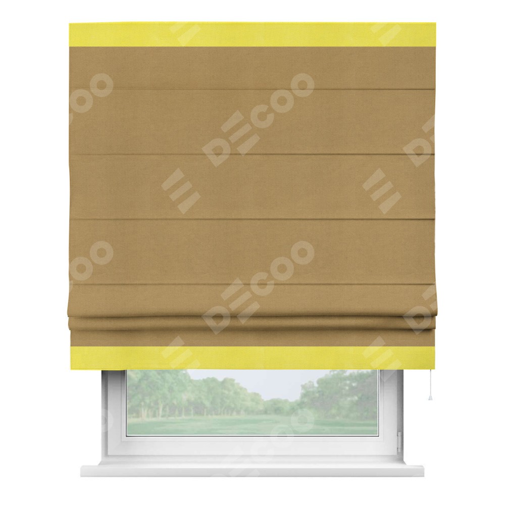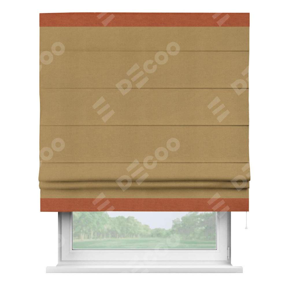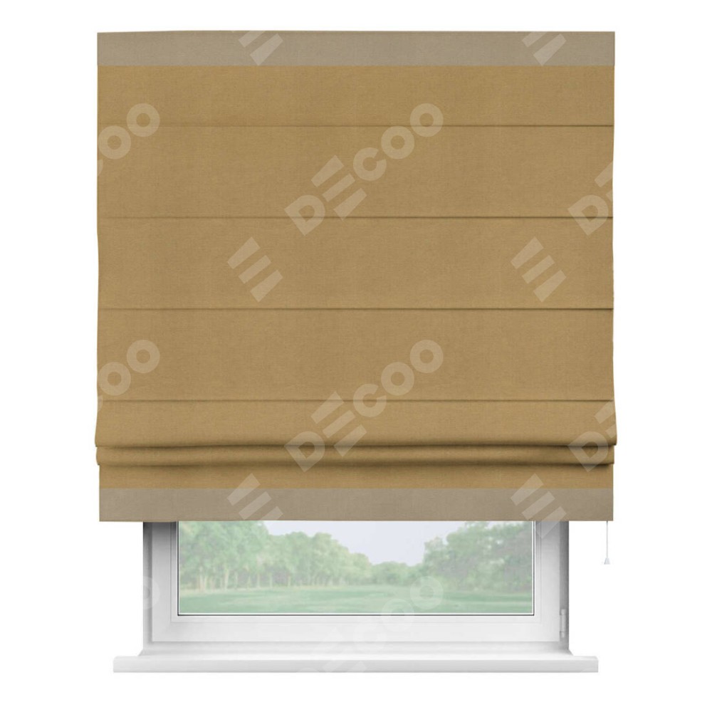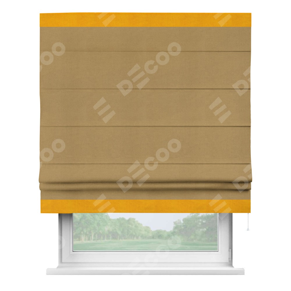 Римская штора производителя «Cortin», используется для проёма, пошита из ткани вельвет горчица, артикул ткани 17760. Отделка шторы кантом «Горизонт», ткань для канта используется из вельвета разной расцветки на выбор. Имеет универсальный механизм и подходит для монтажа: на потолок, на стену и в нишу.