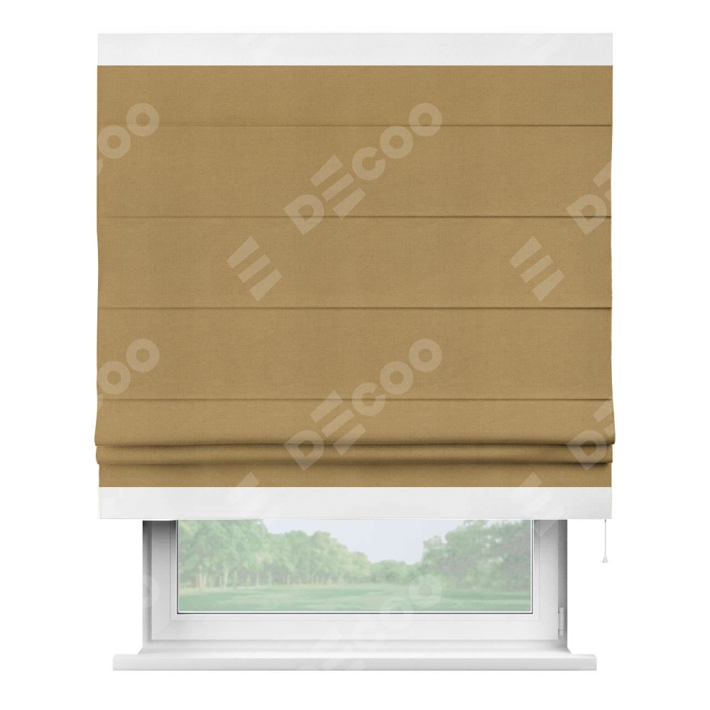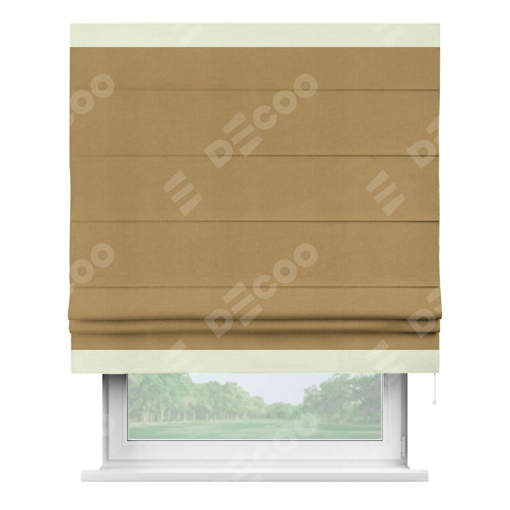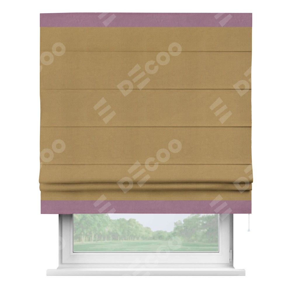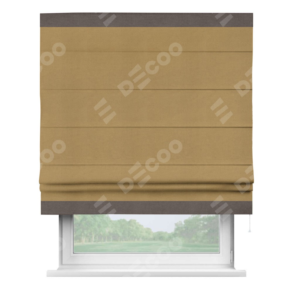 Римская штора производителя «Cortin», используется для проёма, пошита из ткани вельвет горчица, артикул ткани 17760. Отделка шторы кантом «Горизонт», ткань для канта используется из вельвета разной расцветки на выбор. Имеет универсальный механизм и подходит для монтажа: на потолок, на стену и в нишу.