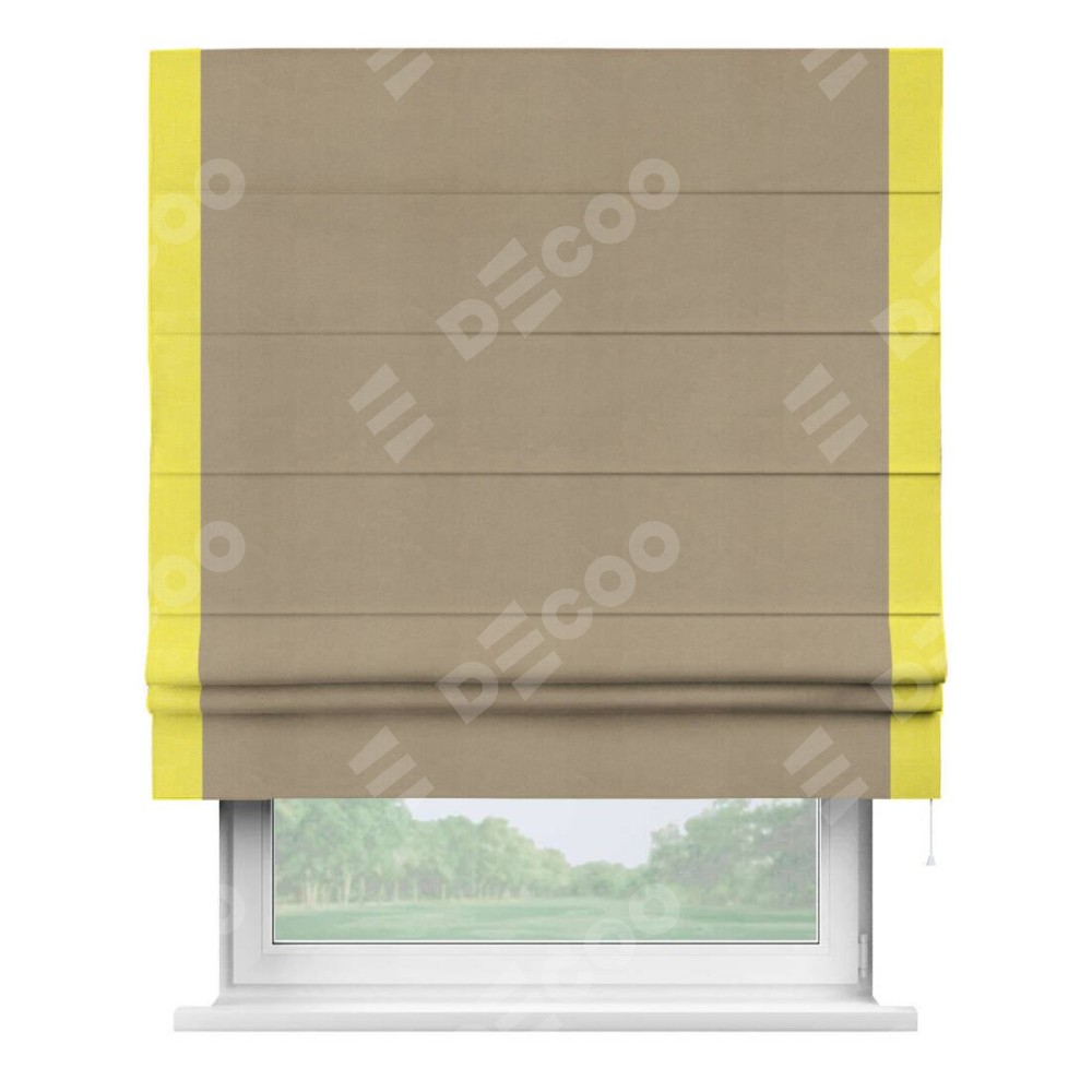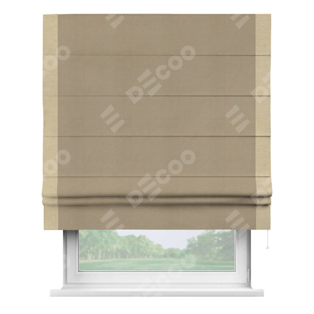 Римская штора производителя «Cortin», используется для проёма, пошита из ткани вельвет кофейный, артикул ткани 30980. Отделка шторы кантом «Стрим Дуо», ткань для канта используется из вельвета разной расцветки на выбор. Имеет универсальный механизм и подходит для монтажа: на потолок, на стену и в нишу.