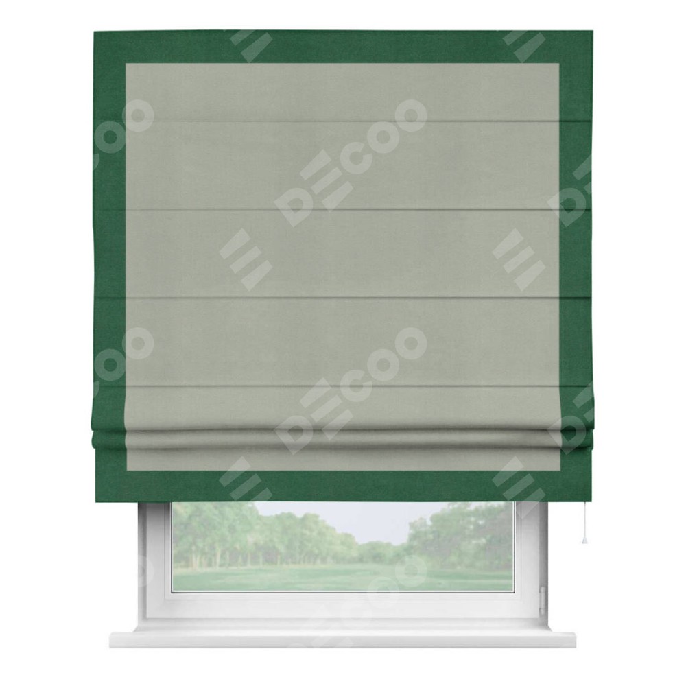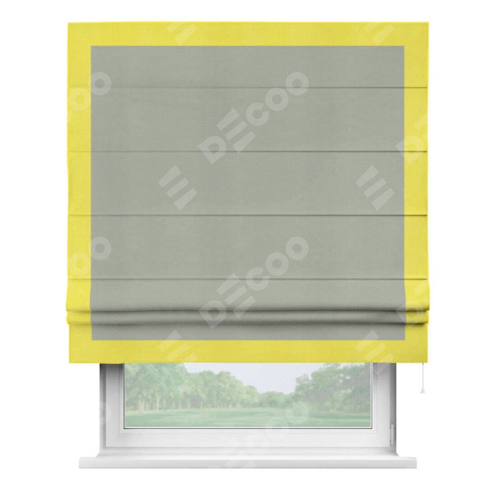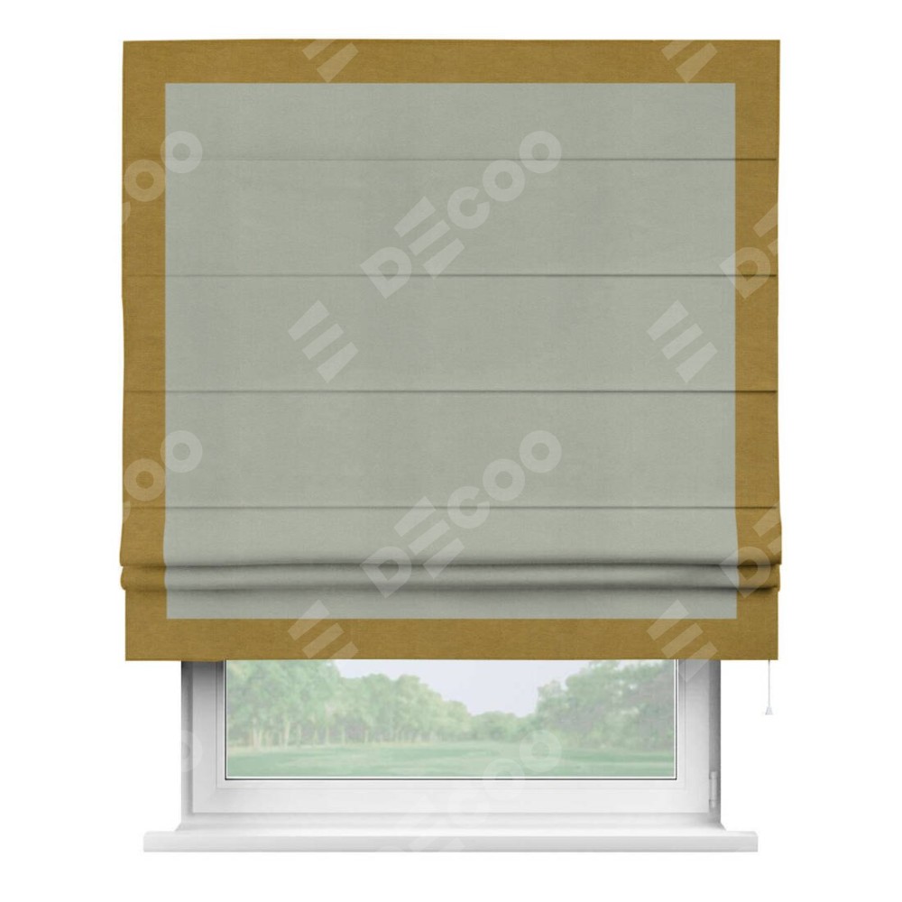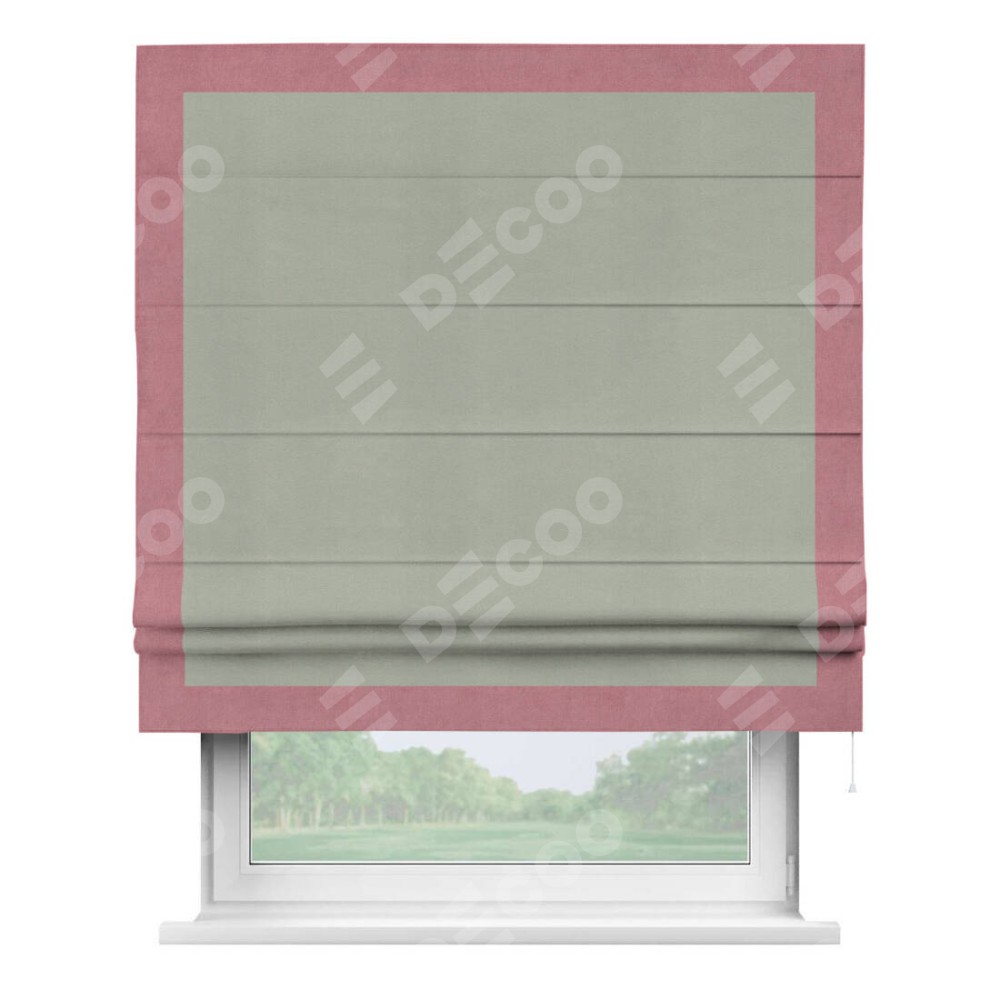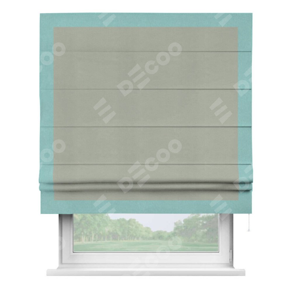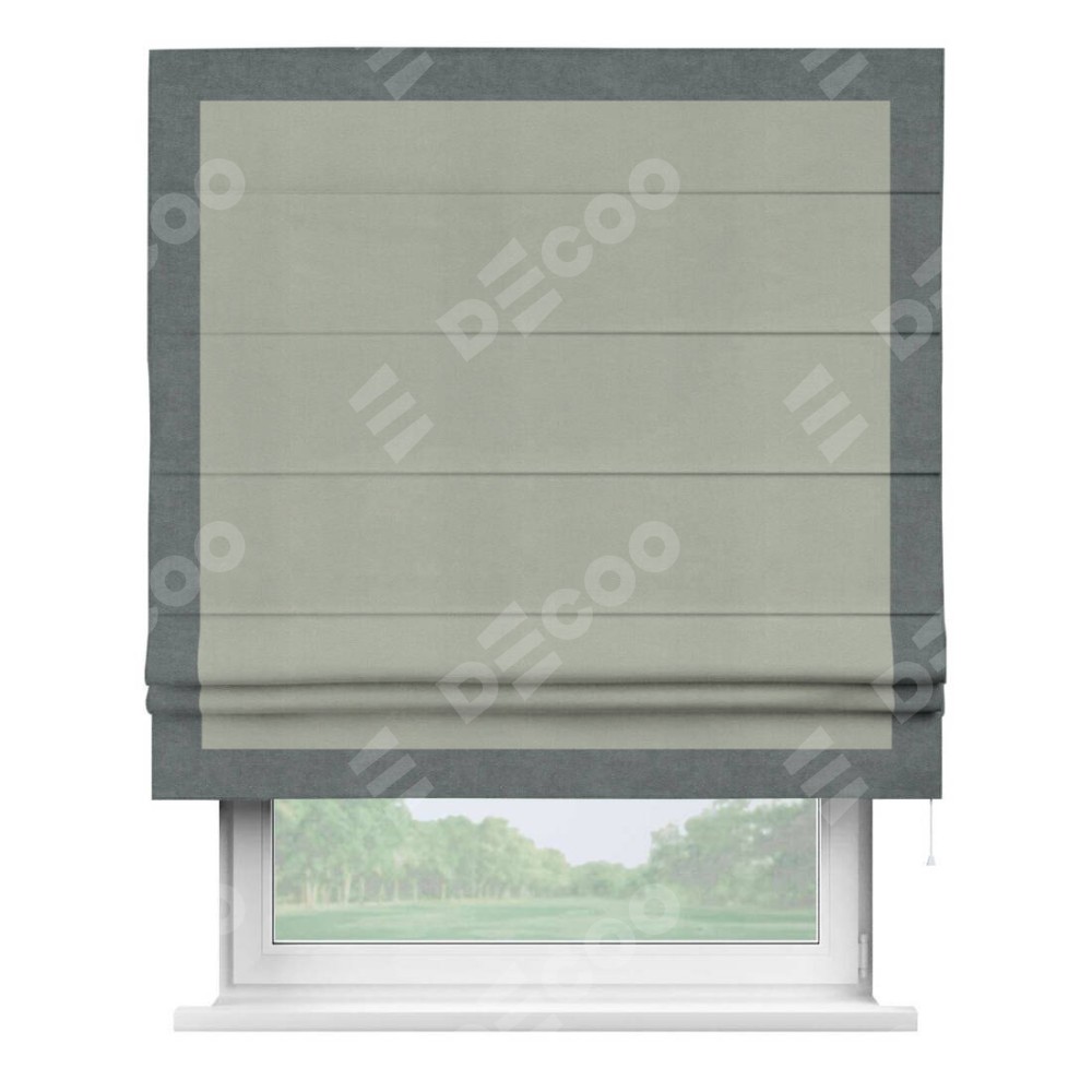 Римская штора производителя «Cortin», используется для проёма, пошита из ткани вельвет cветло-серый, артикул ткани 30980. Отделка шторы кантом «Чесс», ткань для канта используется из вельвета разной расцветки на выбор. Имеет универсальный механизм и подходит для монтажа: на потолок, на стену и в нишу.