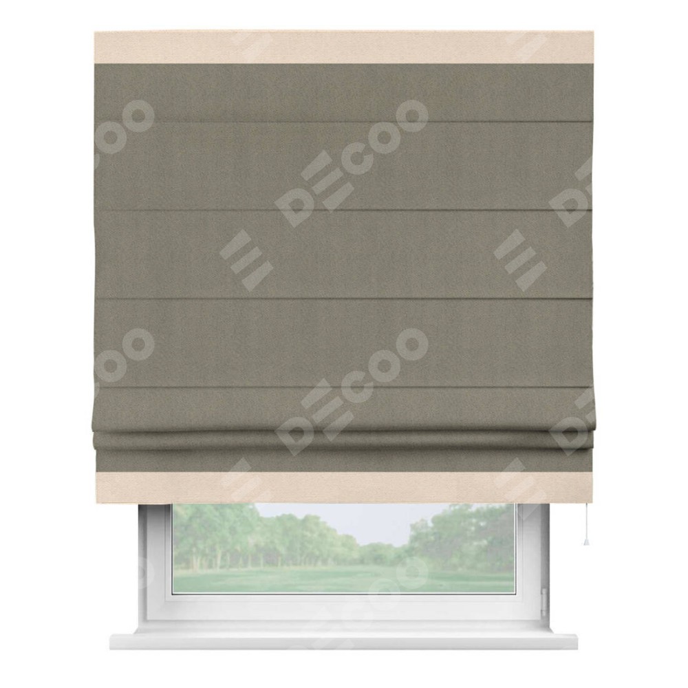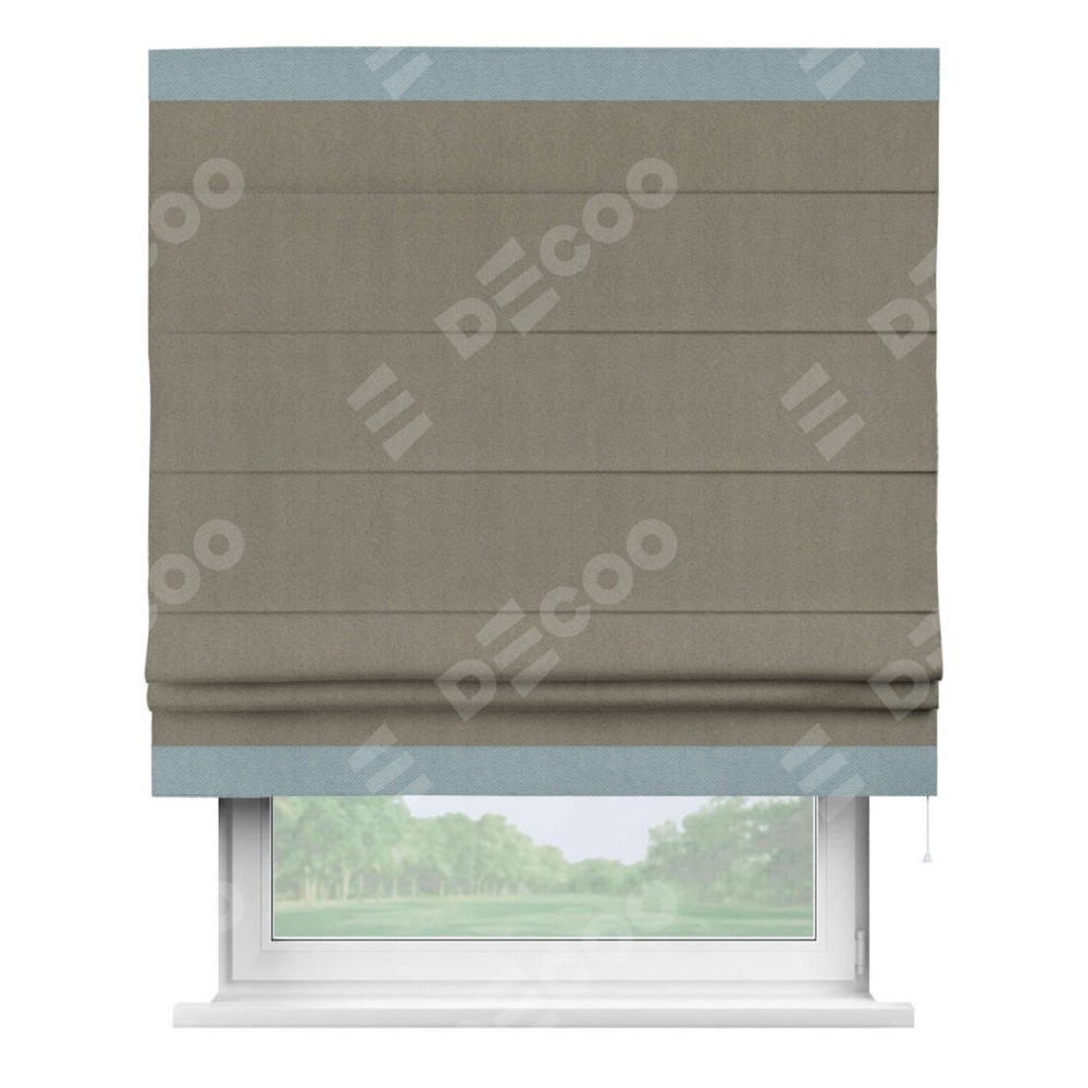 Римская штора производителя «Cortin», используется для проёма, пошита из ткани блэкаут с блеском графитовый, артикул 34648. Отделка шторы кантом «Горизонт», ткань для канта используется из блэкаута с блеском разной расцветки на выбор. Изнаночная сторона материала черного цвета, что обеспечивает необходимую светонепроницаемость. Имеет универсальный механизм и подходит для монтажа: на потолок, на стену и в нишу.