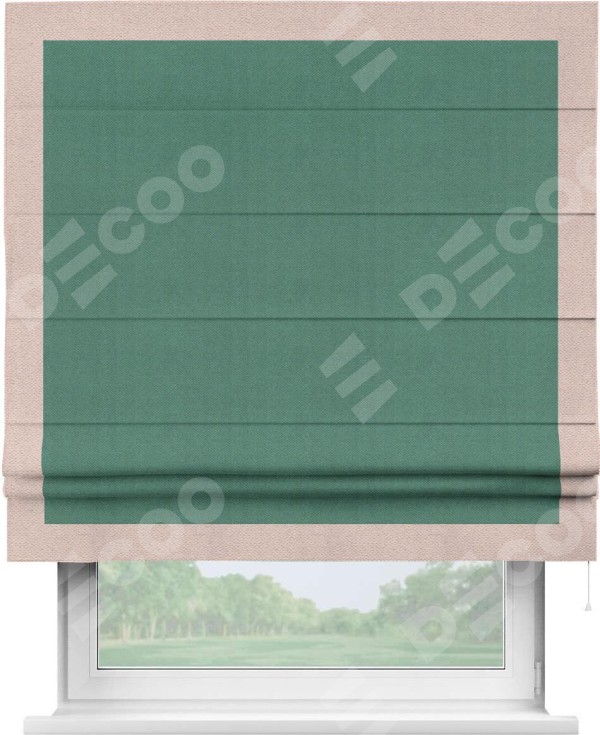 Римская штора производителя «Cortin», используется для проёма, пошита из ткани блэкаут с блеском изумрудный, артикул 34628. Отделка шторы кантом «Чесс», ткань для канта используется из блэкаута с блеском разной расцветки на выбор. Изнаночная сторона материала черного цвета, что обеспечивает необходимую светонепроницаемость. Имеет универсальный механизм и подходит для монтажа: на потолок, на стену и в нишу.