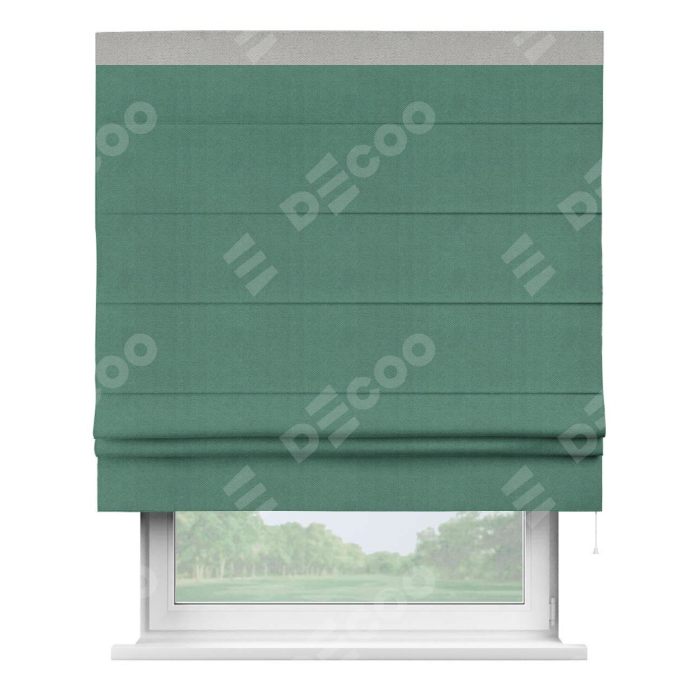 Римская штора производителя «Cortin», используется для проёма, пошита из ткани блэкаут с блеском изумрудный, артикул 34628. Отделка шторы кантом «Кинг», ткань для канта используется из блэкаута с блеском разной расцветки на выбор. Изнаночная сторона материала черного цвета, что обеспечивает необходимую светонепроницаемость. Имеет универсальный механизм и подходит для монтажа: на потолок, на стену и в нишу.