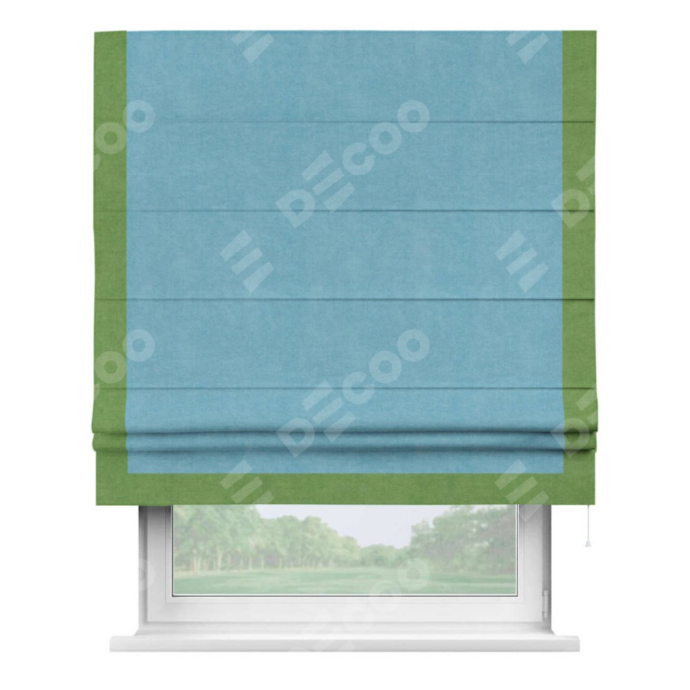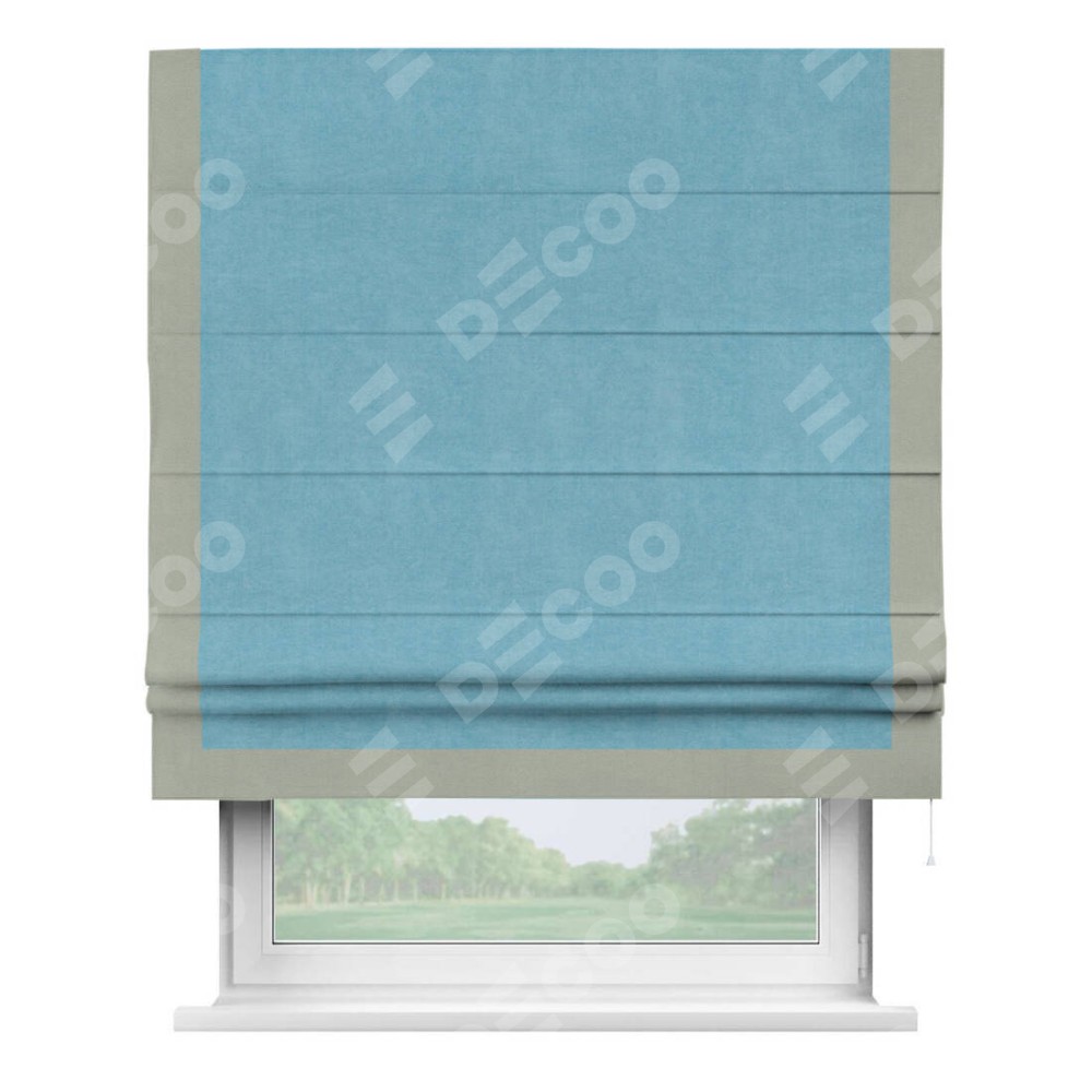 Римская штора производителя «Cortin», используется для проёма, пошита из ткани вельвет ментоловый, артикул ткани 10443. Отделка шторы кантом «Виктория», ткань для канта используется из вельвета разной расцветки на выбор. Имеет универсальный механизм и подходит для монтажа: на потолок, на стену и в нишу.
