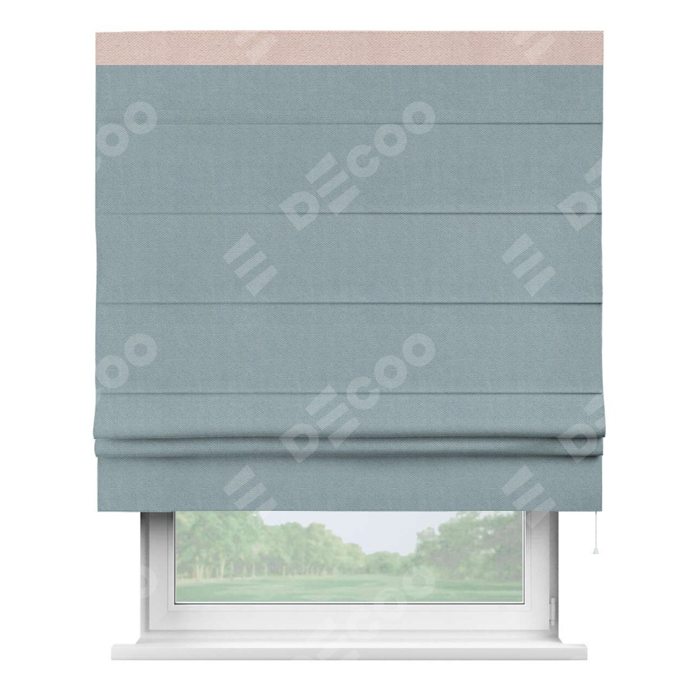 Римская штора производителя «Cortin», используется для проёма, пошита из ткани блэкаут с блеском синий, артикул 34625. Отделка шторы кантом «Кинг», ткань для канта используется из блэкаута с блеском разной расцветки на выбор. Изнаночная сторона материала черного цвета, что обеспечивает необходимую светонепроницаемость. Имеет универсальный механизм и подходит для монтажа: на потолок, на стену и в нишу.