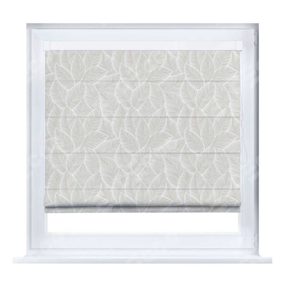 Римская штора производителя «Cortin», устанавливается на створку окна, пошита из ткани блэкаут с нанесением сублимационной печати «Бежевые листья». Штора шьётся по индивидуальным размерам, для данного типа римской шторы возможная ширина от 35 до 150 см., высота до 250 см.