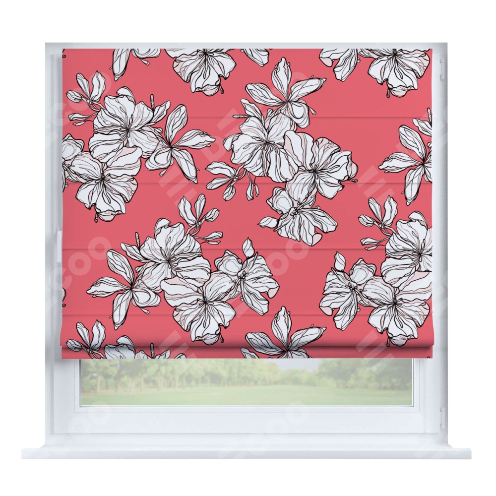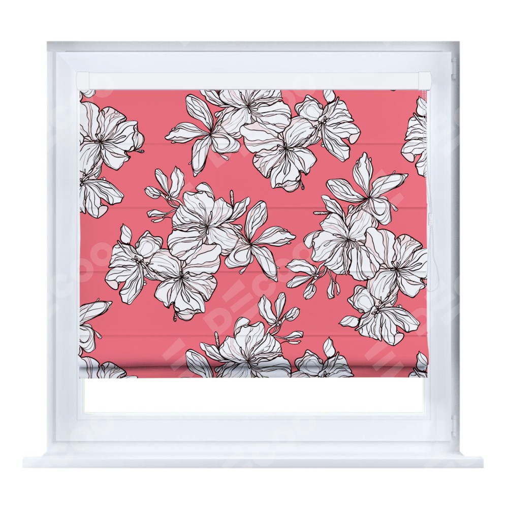 Римская штора производителя «Cortin», устанавливается на створку окна, пошита из ткани блэкаут с нанесением сублимационной печати «Белые цветы». Штора шьётся по индивидуальным размерам, для данного типа римской шторы возможная ширина от 35 до 150 см., высота до 250 см.