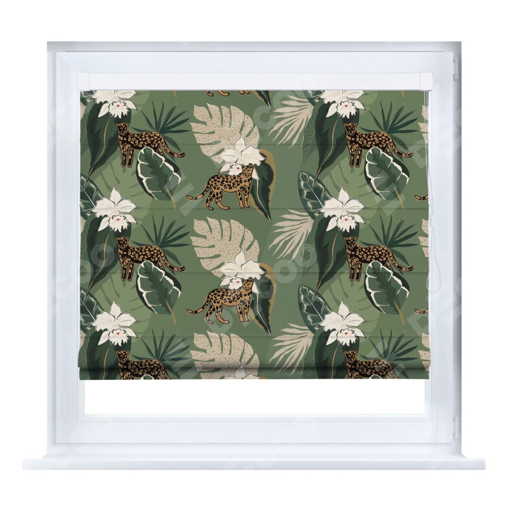 Римская штора производителя «Cortin», устанавливается на створку окна, пошита из ткани блэкаут с нанесением сублимационной печати «В тропическом лесу». Штора шьётся по индивидуальным размерам, для данного типа римской шторы возможная ширина от 35 до 150 см., высота до 250 см.