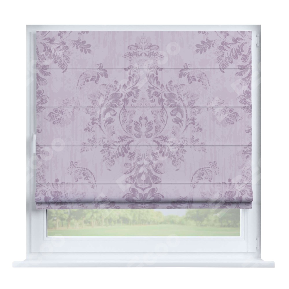 Римская штора производителя «Cortin», устанавливается на створку окна, пошита из ткани блэкаут с нанесением сублимационной печати «Винтажный узор сиреневый». Штора шьётся по индивидуальным размерам, для данного типа римской шторы возможная ширина от 35 до 150 см., высота до 250 см.