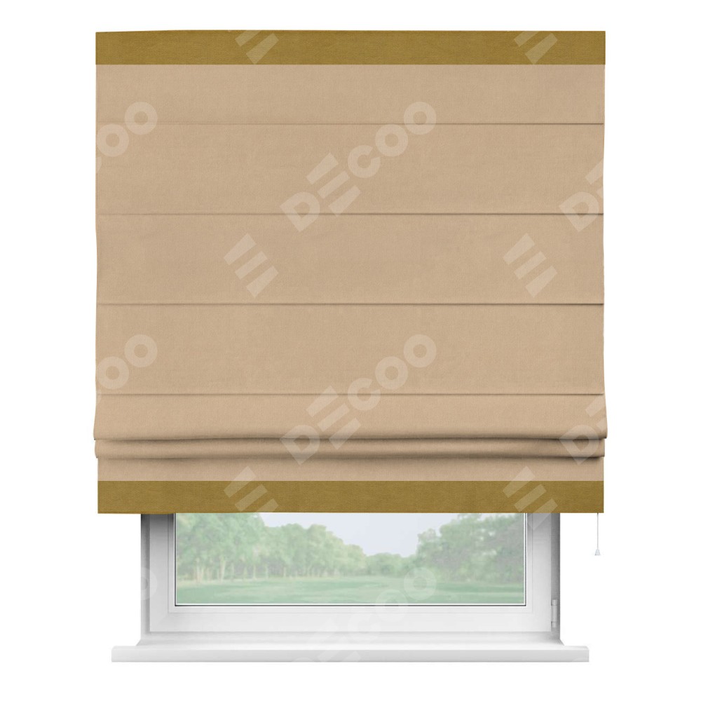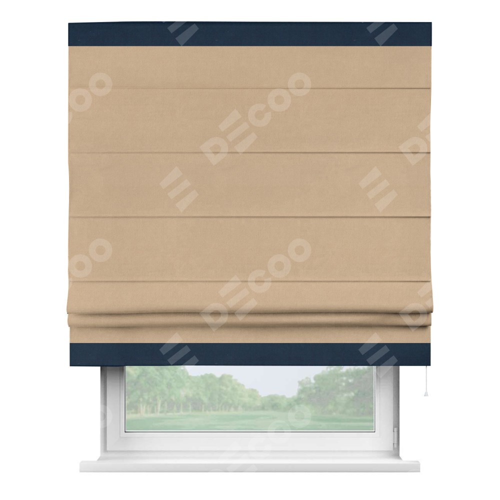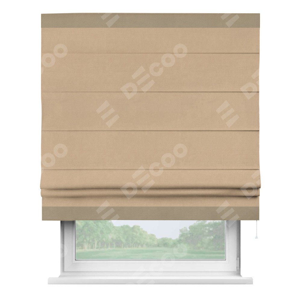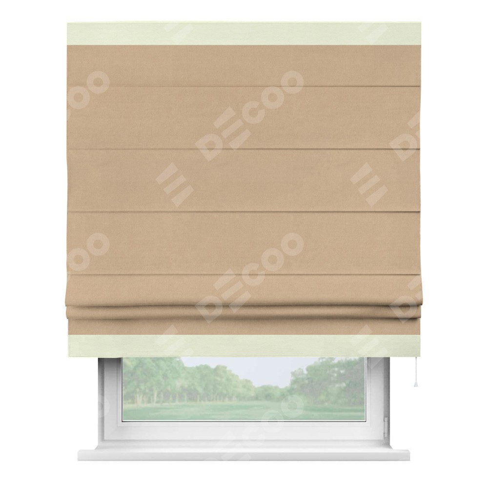 Римская штора производителя «Cortin», используется для проёма, пошита из ткани вельвет песочный, артикул ткани 17740. Отделка шторы кантом «Горизонт», ткань для канта используется из вельвета разной расцветки на выбор. Имеет универсальный механизм и подходит для монтажа: на потолок, на стену и в нишу.