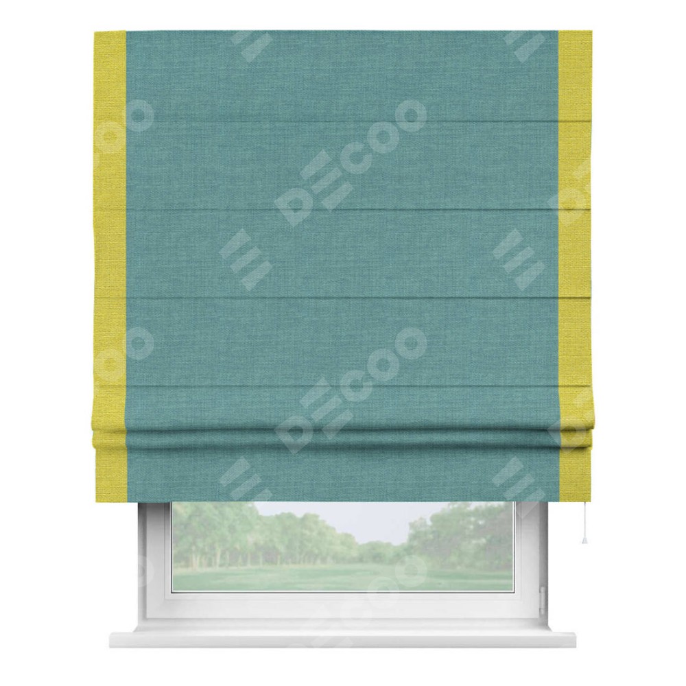 Римская штора производителя «Cortin», используется для проёма, пошита из ткани лён бирюза, артикул 7446. Отделка шторы кантом «Стрим Дуо», ткань для канта используется из льна разной расцветки на выбор. Имеет универсальный механизм и подходит для монтажа: на потолок, на стену и в нишу.