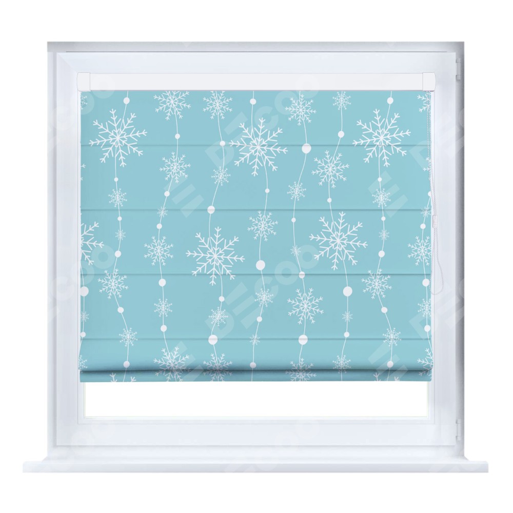Римская штора производителя «Cortin», устанавливается на створку окна, пошита из ткани блэкаут с нанесением сублимационной печати «Гирлянда из снежинок». Штора шьётся по индивидуальным размерам, для данного типа римской шторы возможная ширина от 35 до 150 см., высота до 250 см.