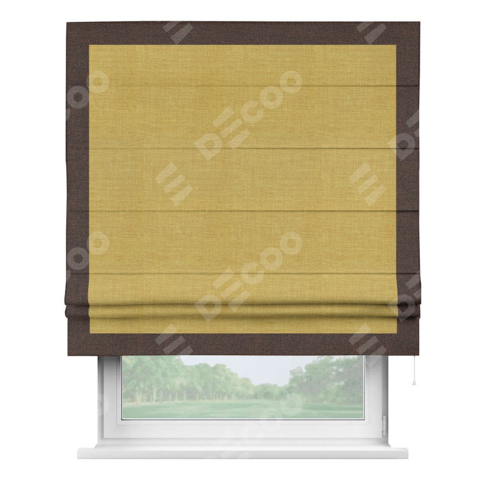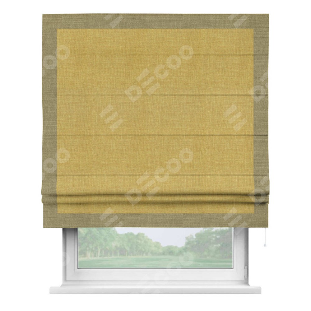 Римская штора производителя «Cortin», используется для проёма, пошита из ткани лён горчичный, артикул 74740. Отделка шторы кантом «Чесс», ткань для канта используется из льна разной расцветки на выбор. Имеет универсальный механизм и подходит для монтажа: на потолок, на стену и в нишу.