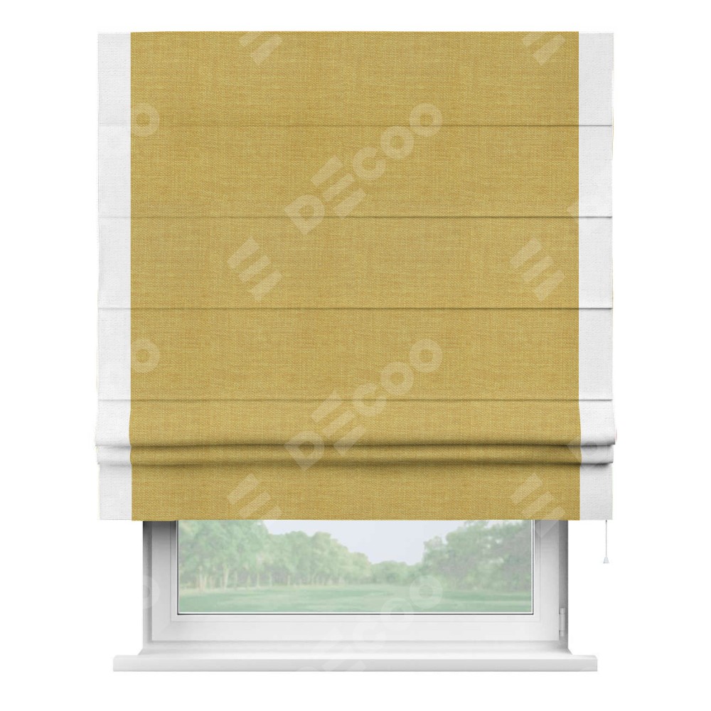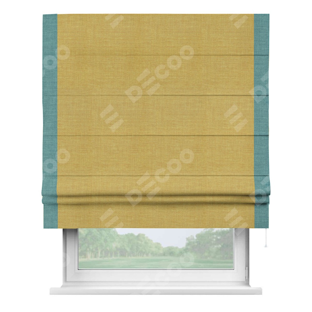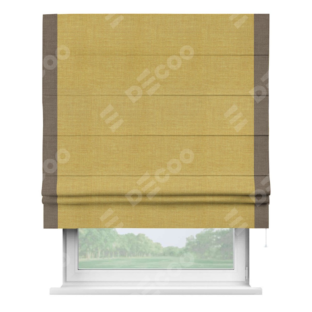 Римская штора производителя «Cortin», используется для проёма, пошита из ткани лён горчичный, артикул 74740. Отделка шторы кантом «Стрим Дуо», ткань для канта используется из льна разной расцветки на выбор. Имеет универсальный механизм и подходит для монтажа: на потолок, на стену и в нишу.