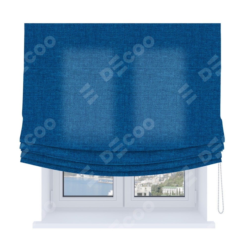 Римская штора Soft производителя «Cortin», используется для проёма, пошита из ткани лён синий, артикул ткани 63742. Имеет универсальный механизм и подходит для монтажа: на потолок, на стену и в нишу. В отличие от стандартных римских штор, римская штора Soft не имеет горизонтальных вставок и нижнего отвеса. Это позволяет ткани произвольно драпироваться в свободные мягкие складки.