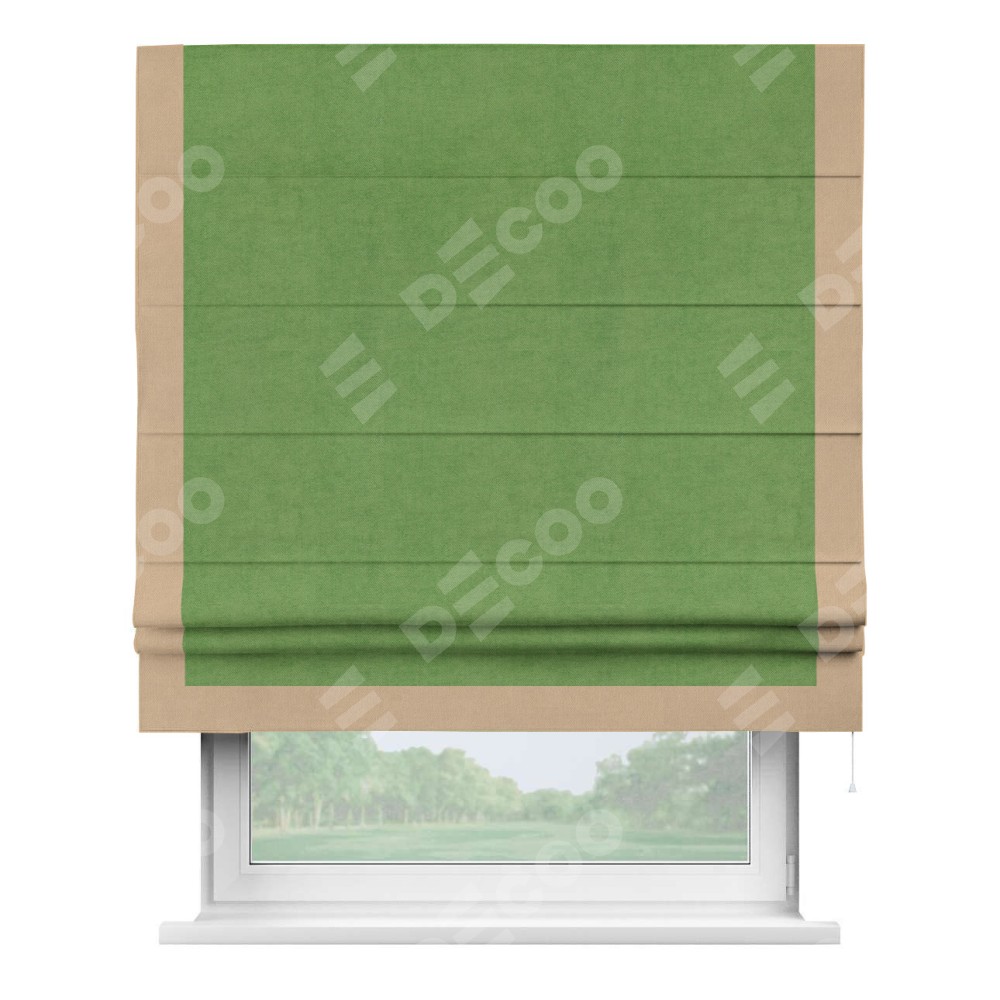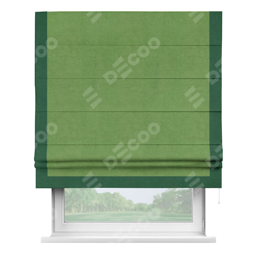 Римская штора производителя «Cortin», используется для проёма, пошита из ткани вельвет салатовый, артикул ткани 87072. Отделка шторы кантом «Виктория», ткань для канта используется из вельвета разной расцветки на выбор. Имеет универсальный механизм и подходит для монтажа: на потолок, на стену и в нишу.