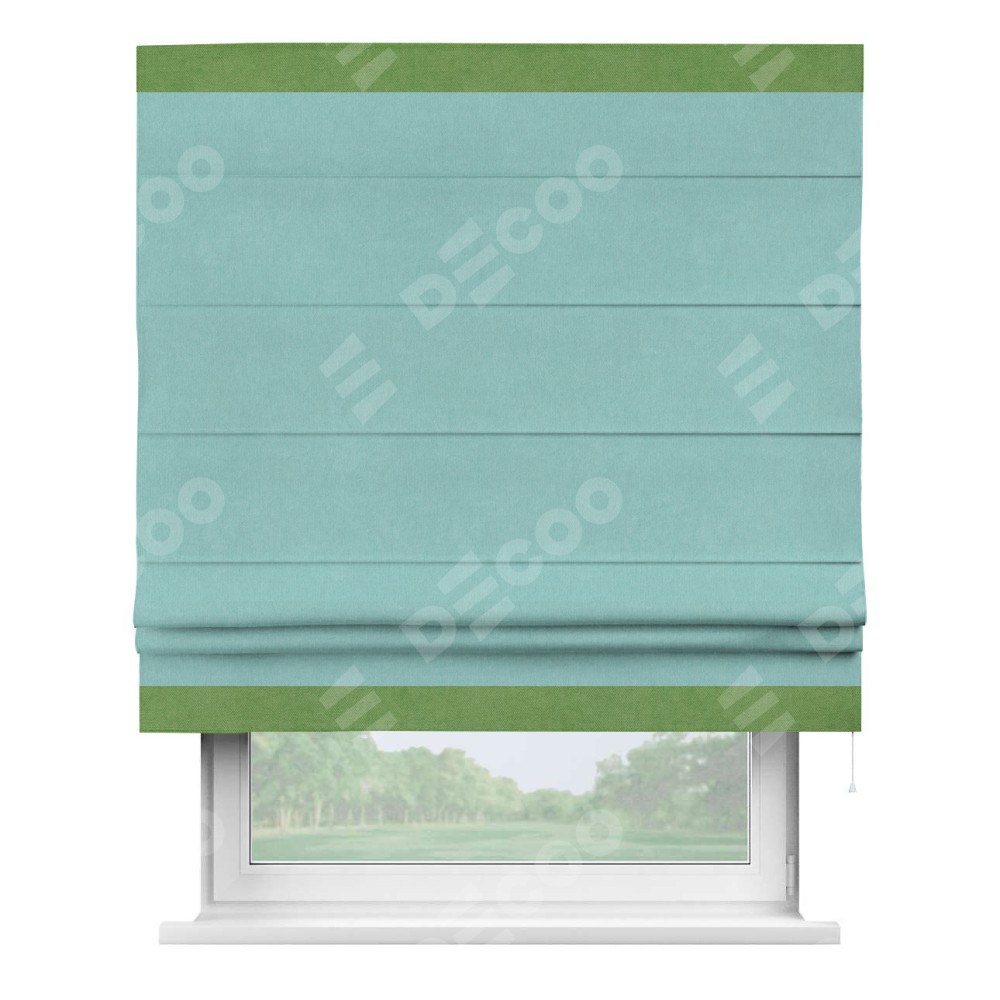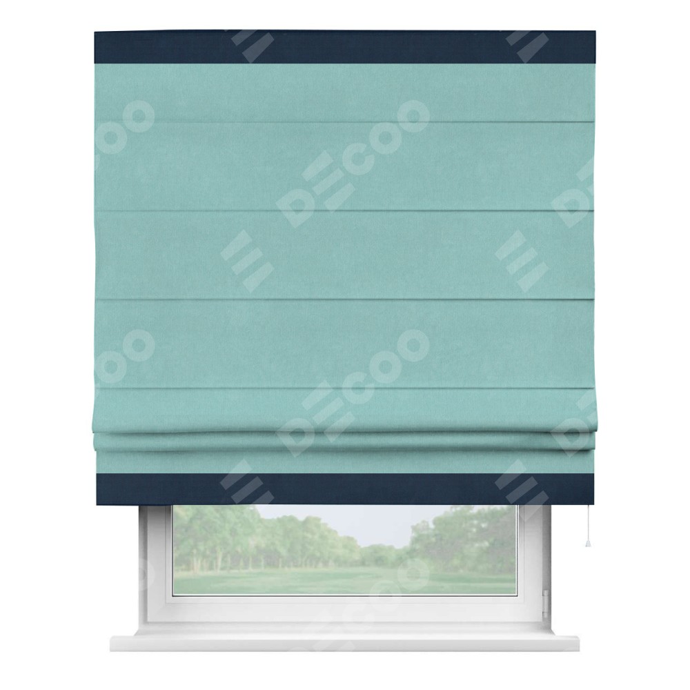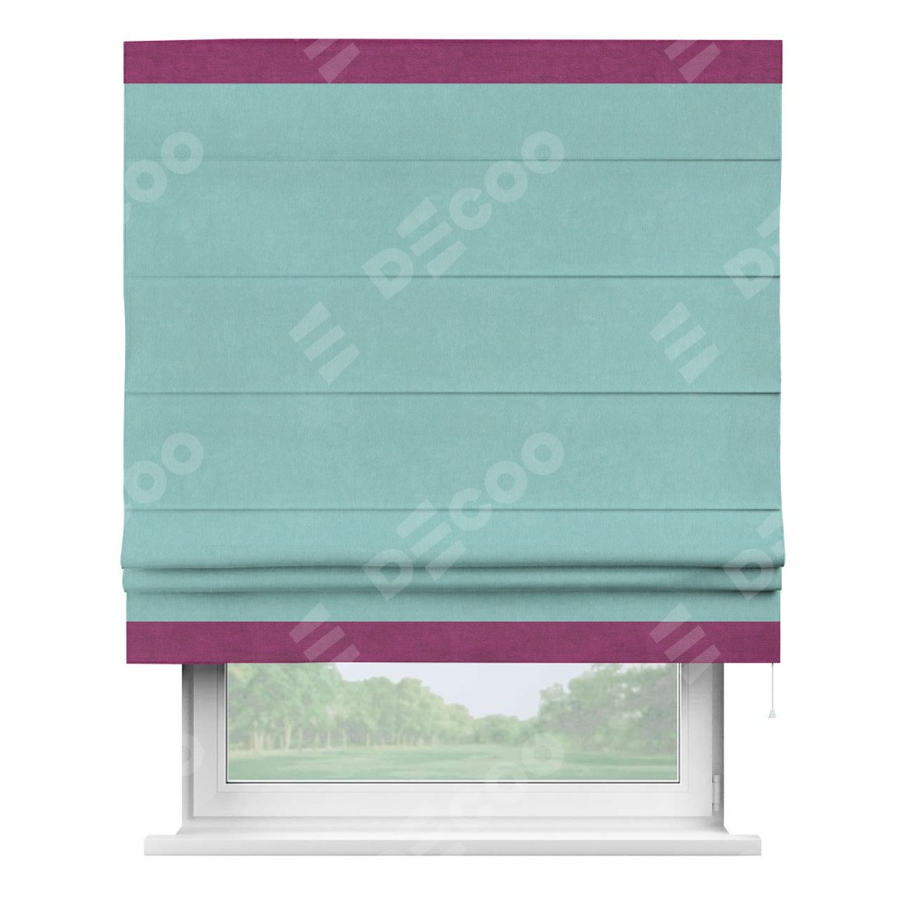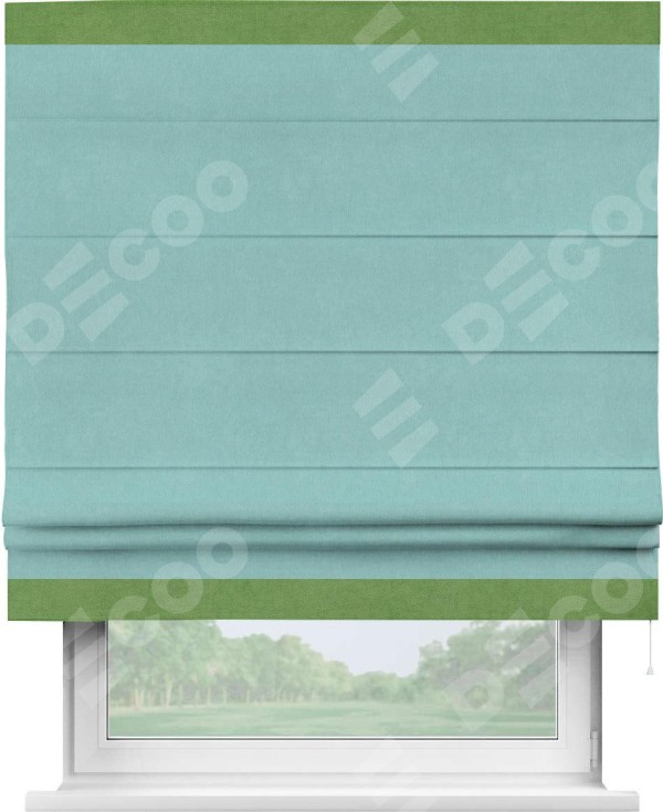 Римская штора производителя «Cortin», используется для проёма, пошита из ткани вельвет тиффани, артикул ткани 17765. Отделка шторы кантом «Горизонт», ткань для канта используется из вельвета разной расцветки на выбор. Имеет универсальный механизм и подходит для монтажа: на потолок, на стену и в нишу.