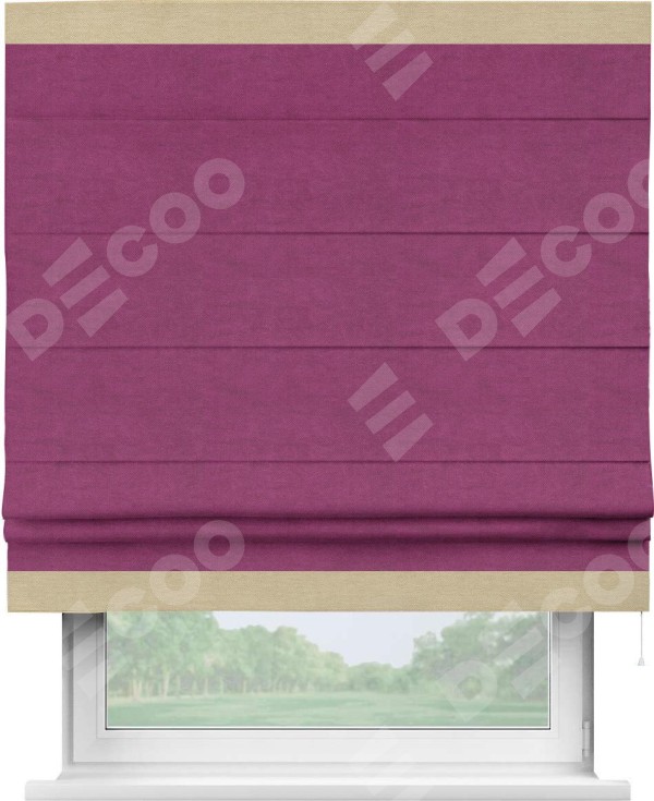 Римская штора производителя «Cortin», используется для проёма, пошита из ткани вельвет фиолетовый, артикул ткани 85552. Отделка шторы кантом «Горизонт», ткань для канта используется из вельвета разной расцветки на выбор. Имеет универсальный механизм и подходит для монтажа: на потолок, на стену и в нишу.