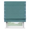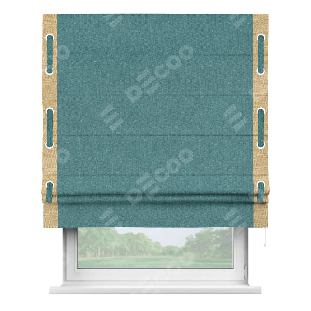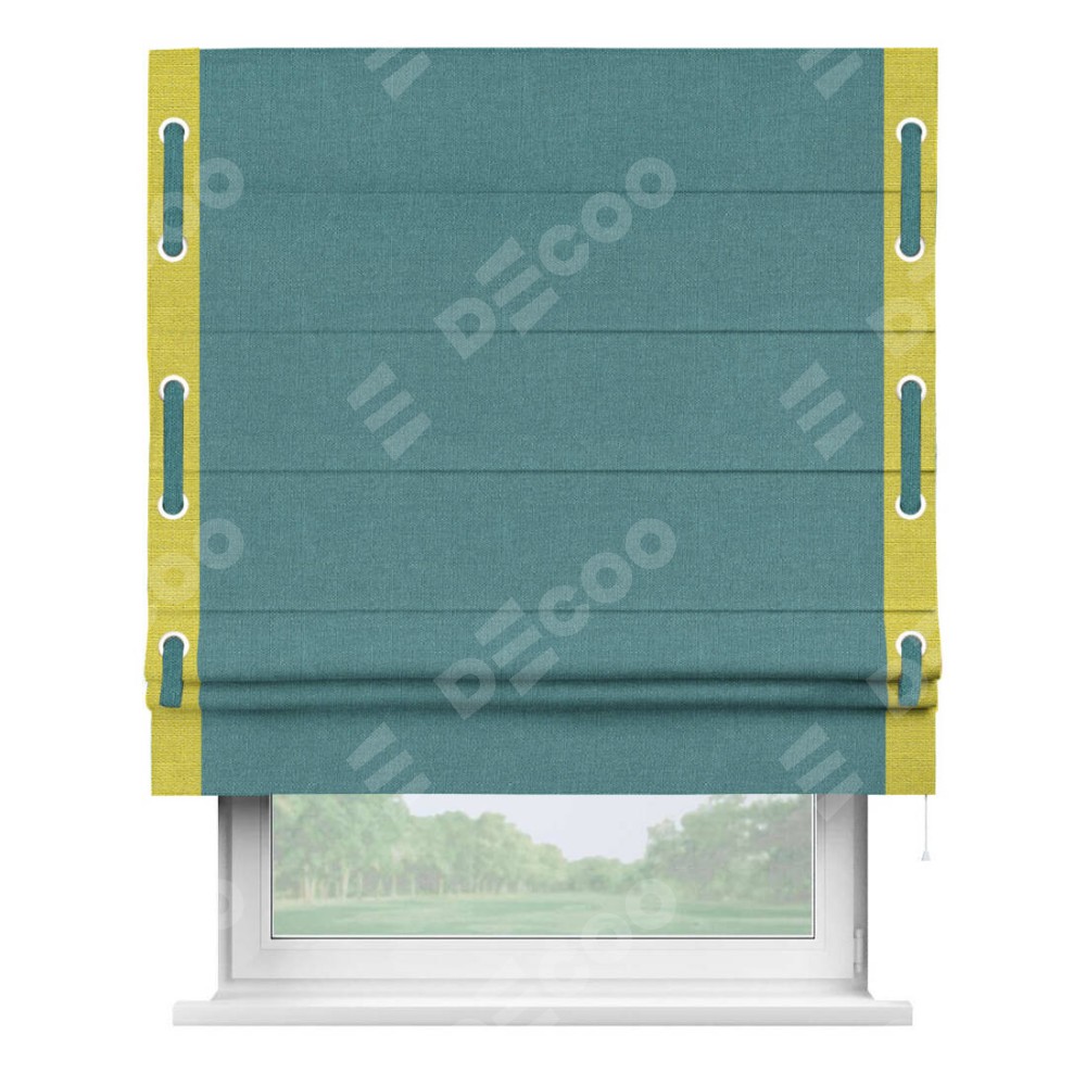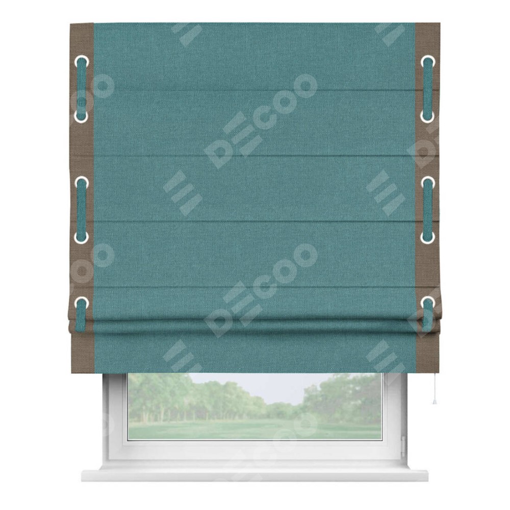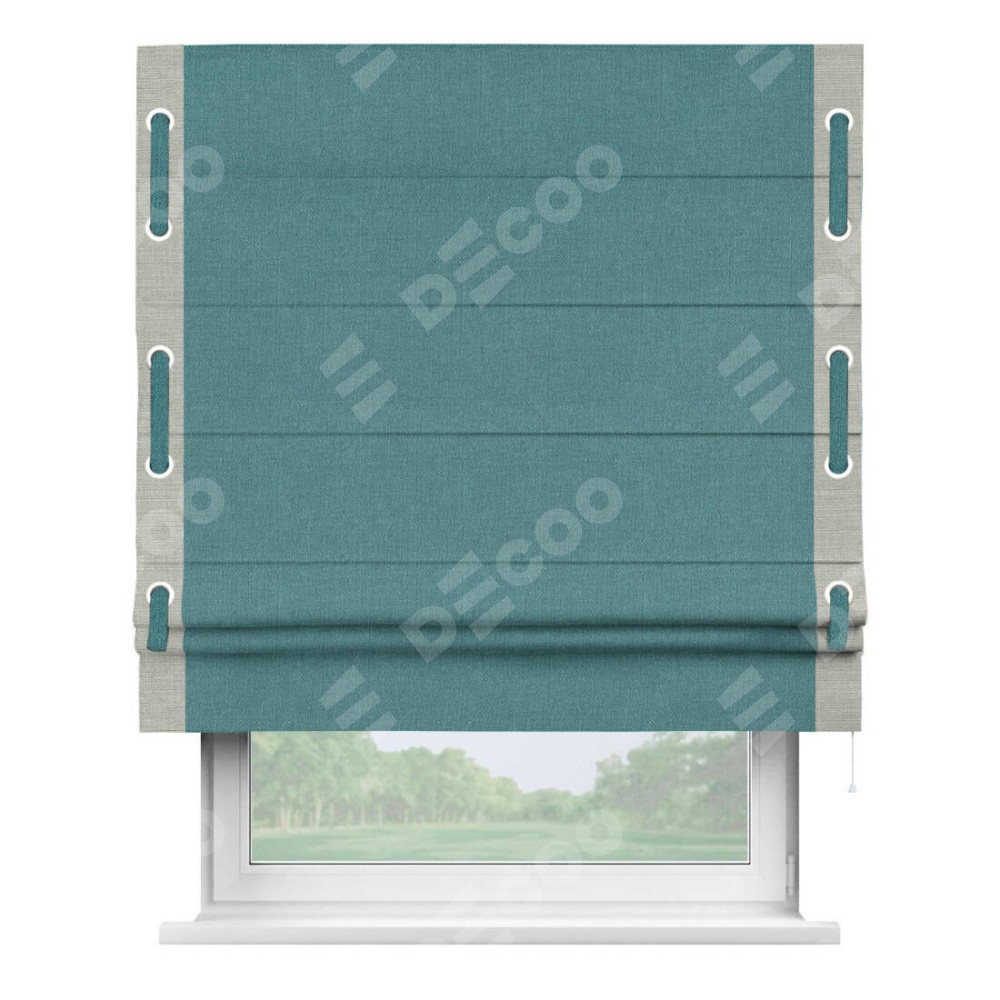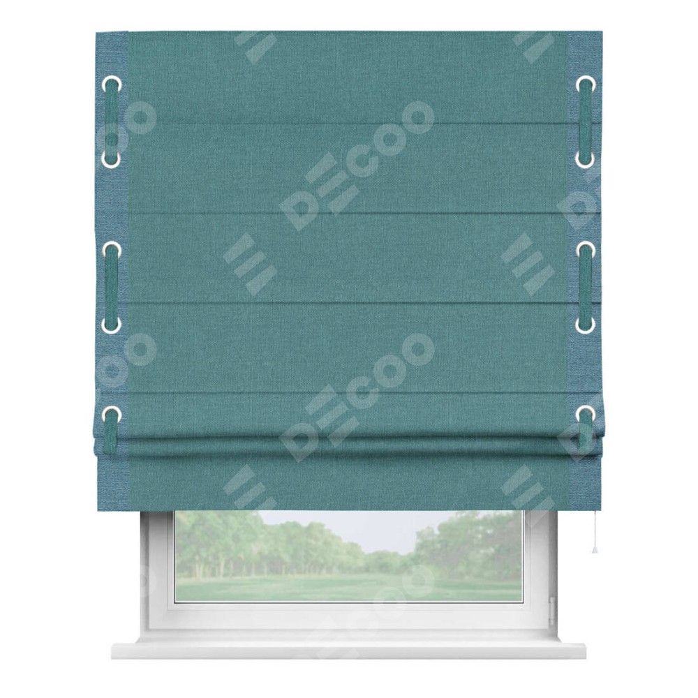 Римская штора производителя «Cortin», используется для проёма, пошита из ткани лён бирюзовый, артикул 53436. Отделка шторы кантом «Стрим Дуо» на кантах расположены люверсы с пояском, ткань для канта используется из льна разной расцветки на выбор. Ткань для пояска обычно используется из основной ткани шторы, а так же можно сделать из любой расцветки по желанию. Имеет универсальный механизм и подходит для монтажа: на потолок, на стену и в нишу.