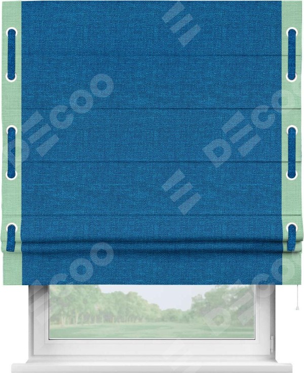 Римская штора производителя «Cortin», используется для проёма, пошита из ткани лён синий, артикул 63742. Отделка шторы кантом «Стрим Дуо» на кантах расположены люверсы с пояском, ткань для канта используется из льна разной расцветки на выбор. Ткань для пояска обычно используется из основной ткани шторы, а так же можно сделать из любой расцветки по желанию. Имеет универсальный механизм и подходит для монтажа: на потолок, на стену и в нишу.