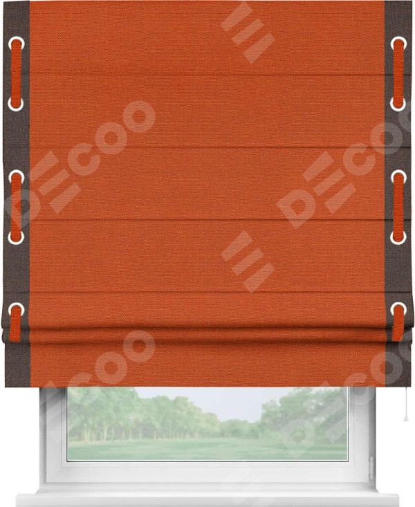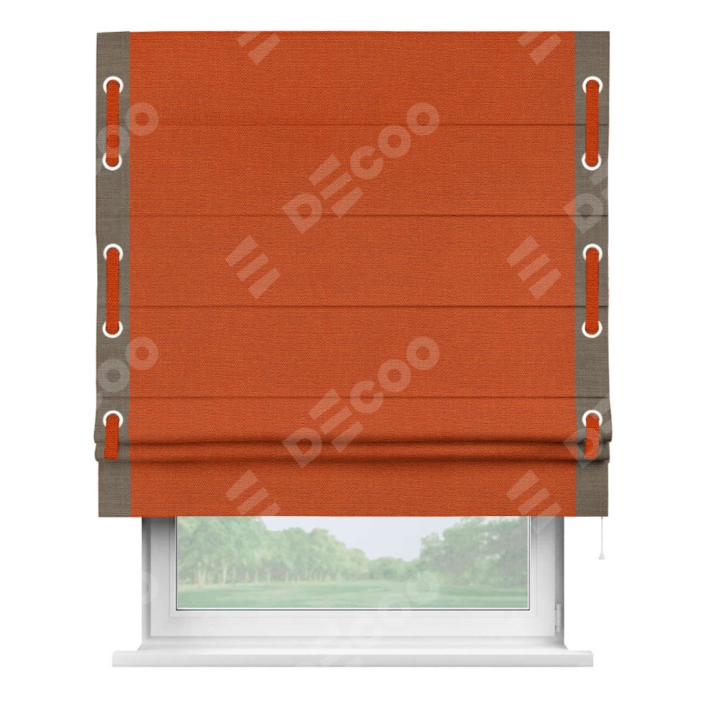 Римская штора производителя «Cortin», используется для проёма, пошита из ткани лён терракотовый, артикул 53440. Отделка шторы кантом «Стрим Дуо» на кантах расположены люверсы с пояском, ткань для канта используется из льна разной расцветки на выбор. Ткань для пояска обычно используется из основной ткани шторы, а так же можно сделать из любой расцветки по желанию. Имеет универсальный механизм и подходит для монтажа: на потолок, на стену и в нишу.