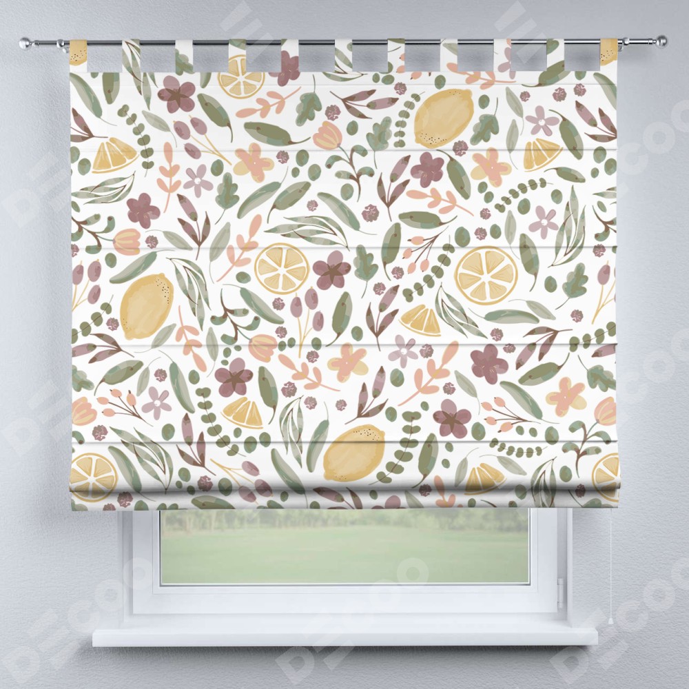 Римская штора производителя «Cortin», используется для проёма, пошита из ткани блэкаут с нанесением сублимационной печати «Лимоны и цветы». Данная модель пошита на петлях, комплектуется на выбор круглым карнизом и подходит для монтажа на стену. Римская штора на петлях имеет простую систему регулировки высоты, отличительным преимуществом данной модели является простой способ монтажа. Достаточно повесить ее на трубу и штора готова!