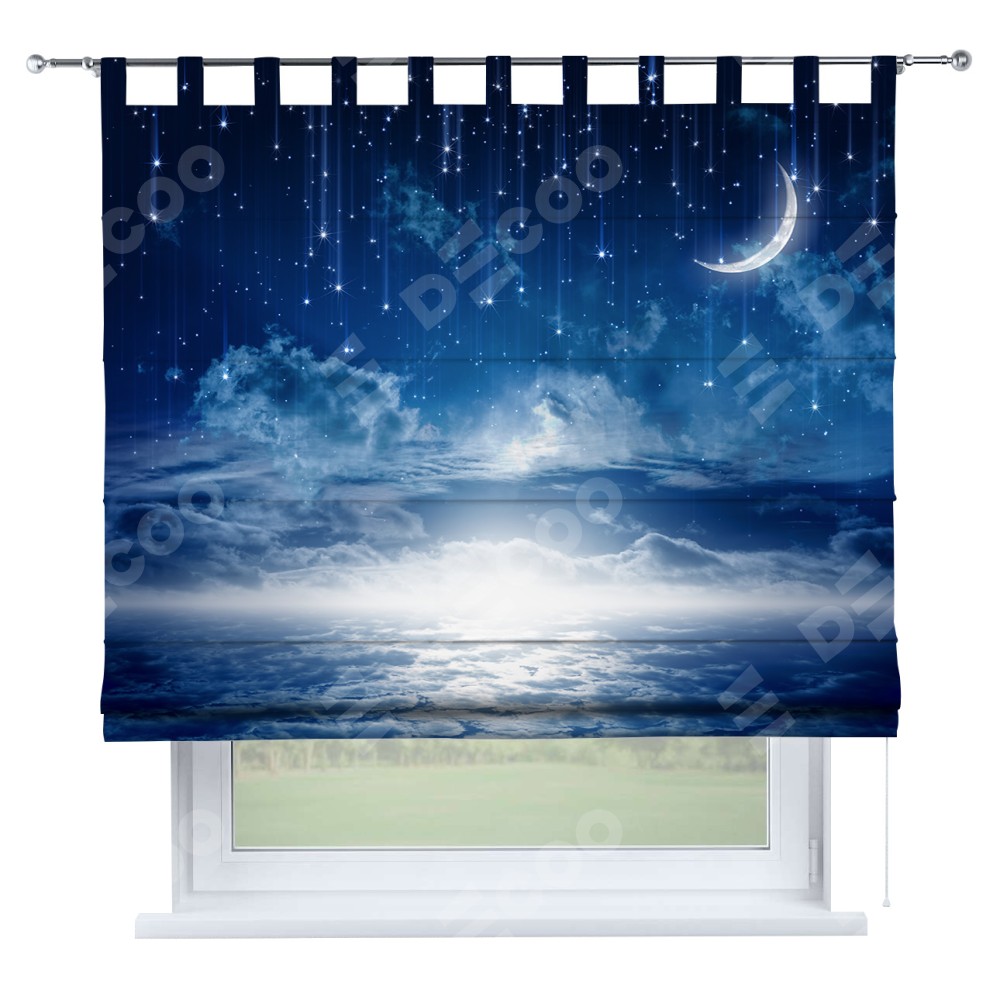 Римская штора производителя «Cortin», используется для проёма, пошита из ткани блэкаут с нанесением сублимационной печати «Ночное небо». Данная модель пошита на петлях, комплектуется на выбор круглым карнизом и подходит для монтажа на стену. Римская штора на петлях имеет простую систему регулировки высоты, отличительным преимуществом данной модели является простой способ монтажа. Достаточно повесить ее на трубу и штора готова!