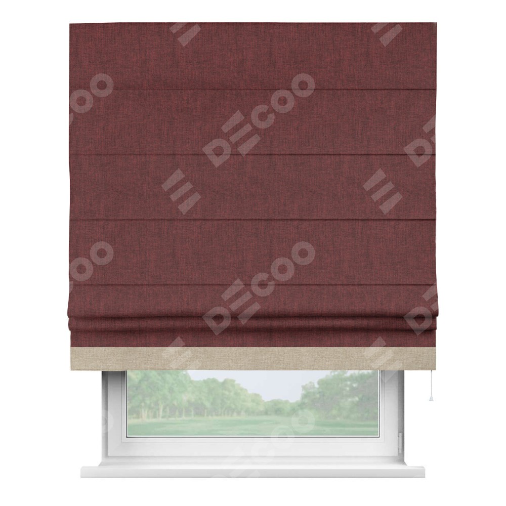 Римская штора производителя «Cortin», используется для проёма, пошита из ткани лён кашемир бордовый, артикул 17213. Отделка шторы кантом «Джестер», ткань для канта используется из льна разной расцветки на выбор. Имеет универсальный механизм и подходит для монтажа: на потолок, на стену и в нишу.
