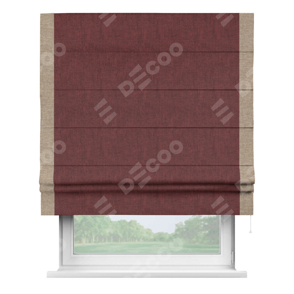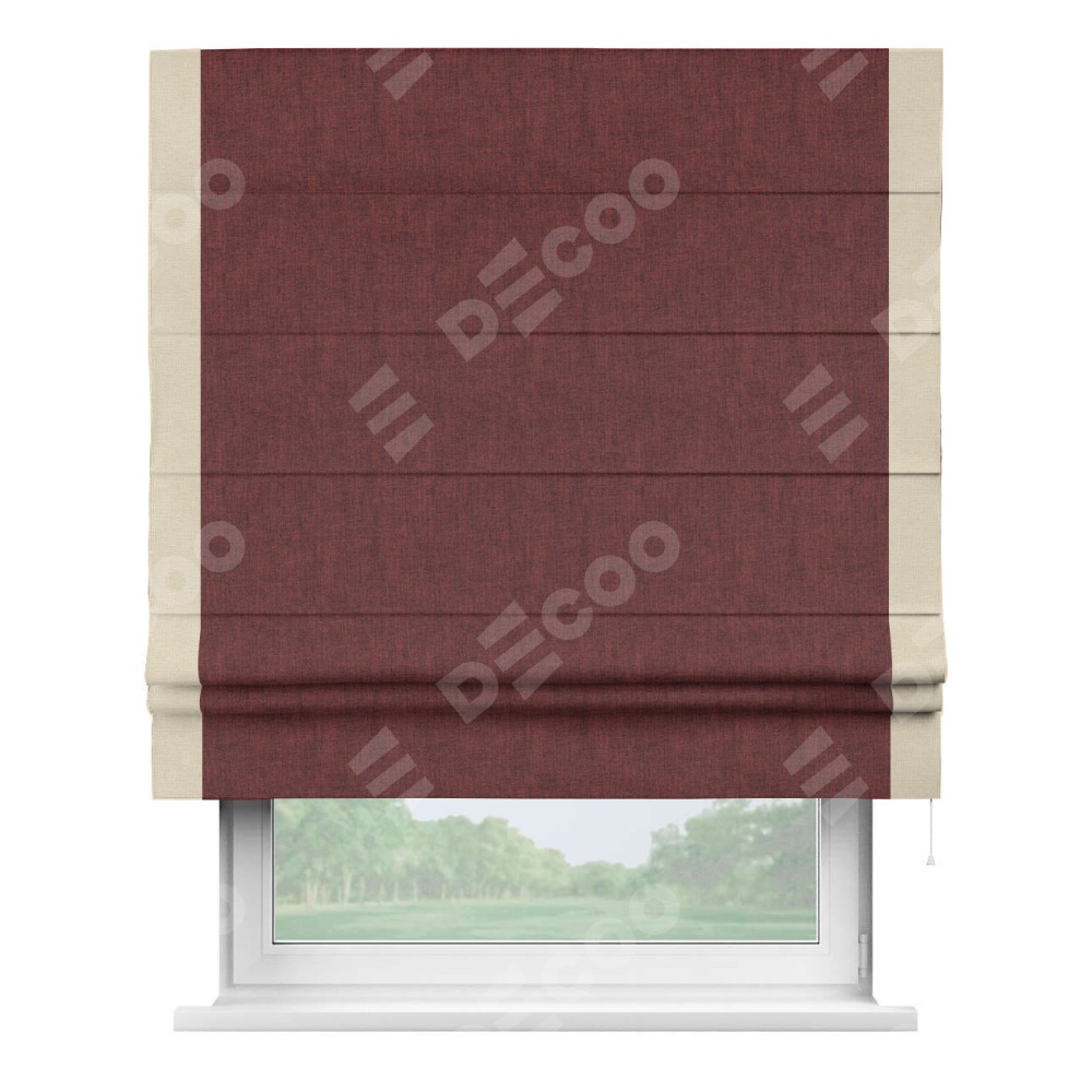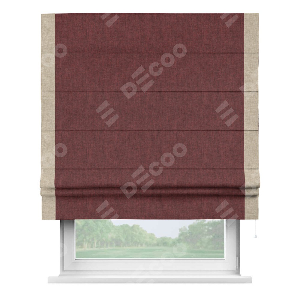 Римская штора производителя «Cortin», используется для проёма, пошита из ткани лён кашемир бордовый, артикул 17213. Отделка шторы кантом «Стрим Дуо», ткань для канта используется из льна разной расцветки на выбор. Имеет универсальный механизм и подходит для монтажа: на потолок, на стену и в нишу.