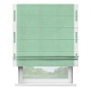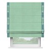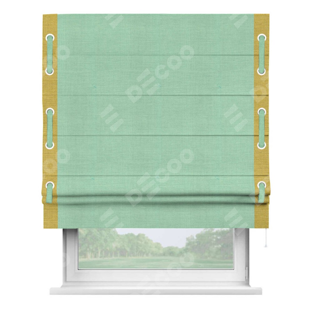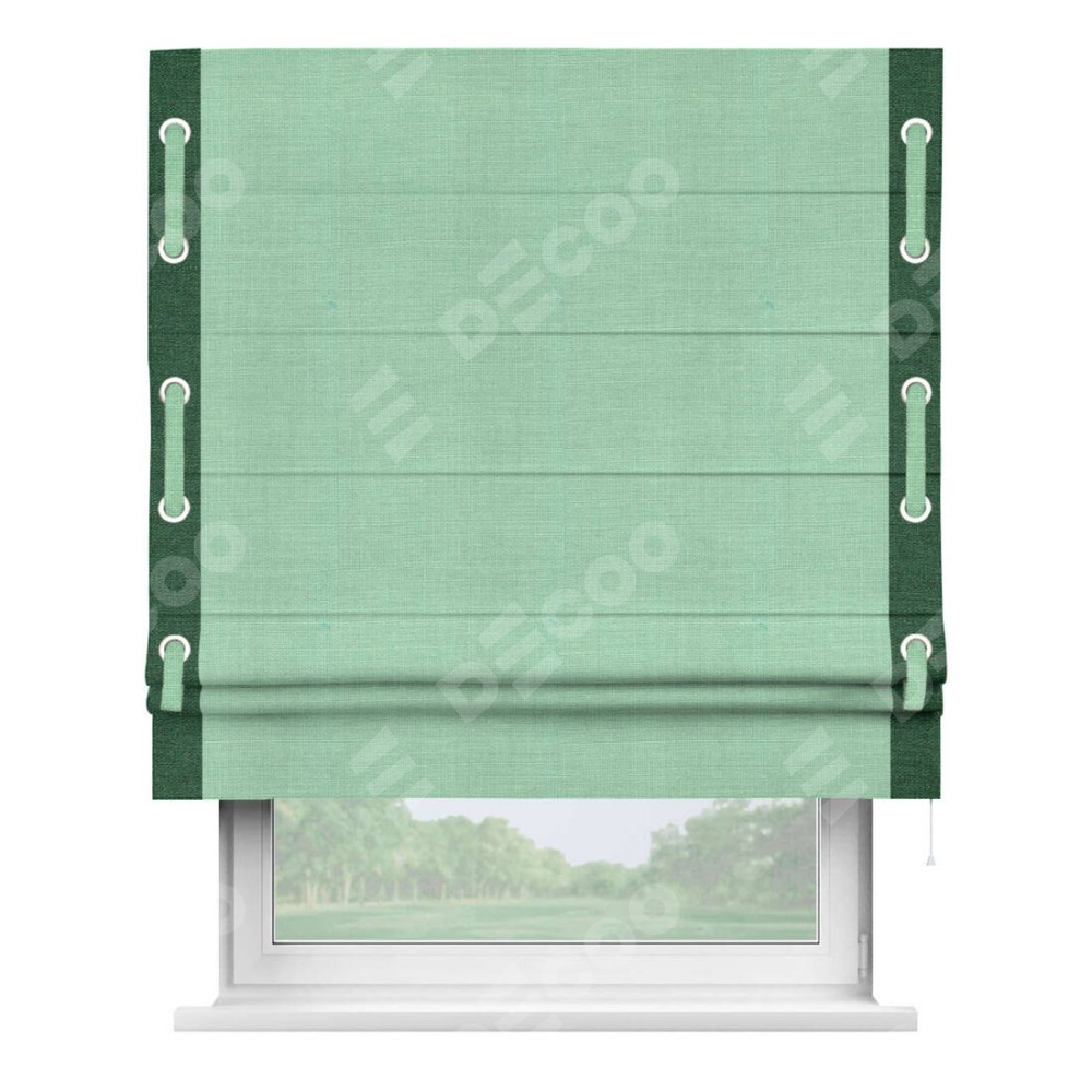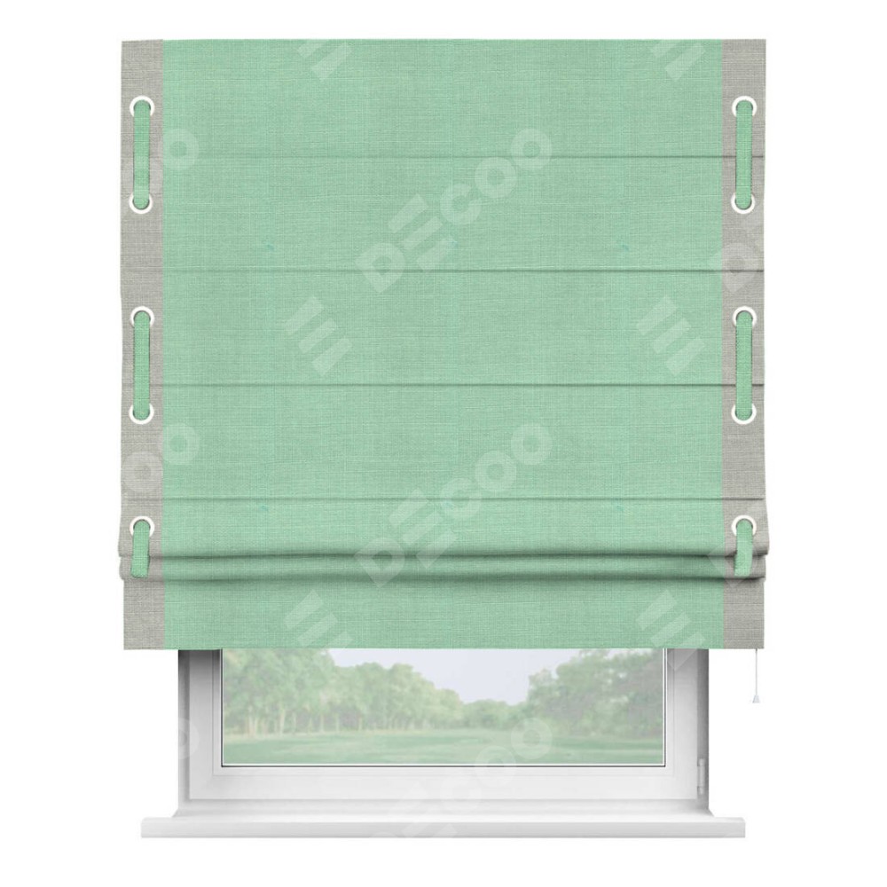 Римская штора производителя «Cortin», используется для проёма, пошита из ткани лён светло-бирюзовый, артикул 74737. Отделка шторы кантом «Стрим Дуо» на кантах расположены люверсы с пояском, ткань для канта используется из льна разной расцветки на выбор. Ткань для пояска обычно используется из основной ткани шторы, а так же можно сделать из любой расцветки по желанию. Имеет универсальный механизм и подходит для монтажа: на потолок, на стену и в нишу.