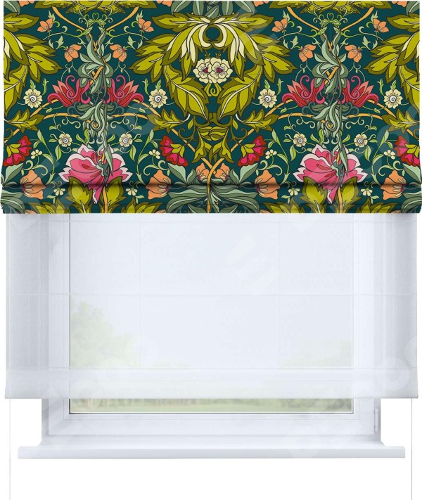 Римская штора день-ночь производителя «Cortin», используется для проёма, пошита из двух полотен, с лицевой блэкаут с нанесением сублимационной печати «Цветок морриса», вторая ткань тюль (по стандарту комплектуется тюль белого цвета артикул V-01). Имеет универсальный механизм и подходит для монтажа: на потолок, на стену и в нишу.