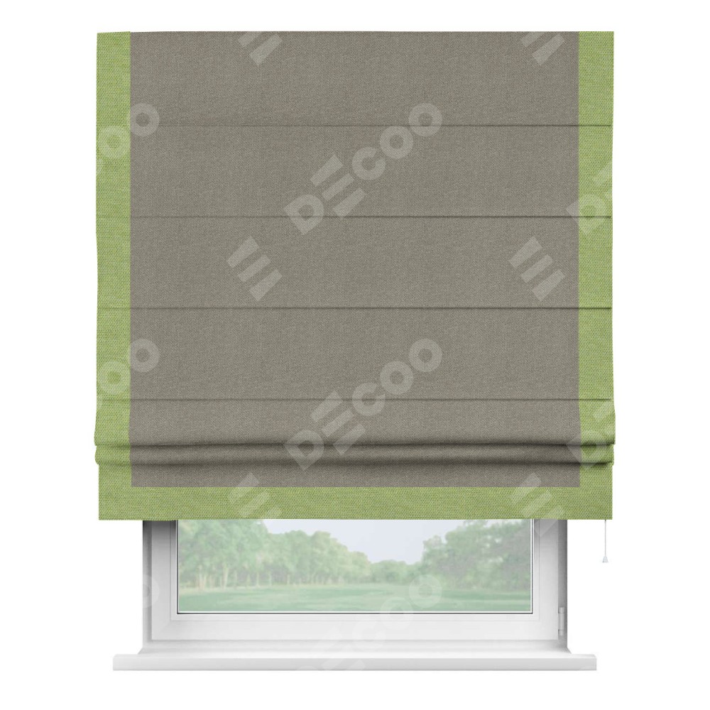 Римская штора производителя «Cortin», используется для проёма, пошита из ткани лён димаут cеро-зелёный, артикул 00003. Отделка шторы кантом «Виктория», ткань для канта используется из льна димаут разной расцветки на выбор. Имеет универсальный механизм и подходит для монтажа: на потолок, на стену и в нишу.