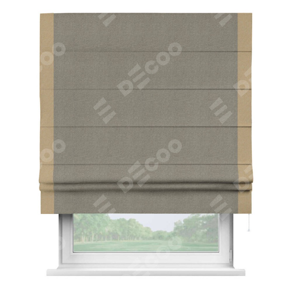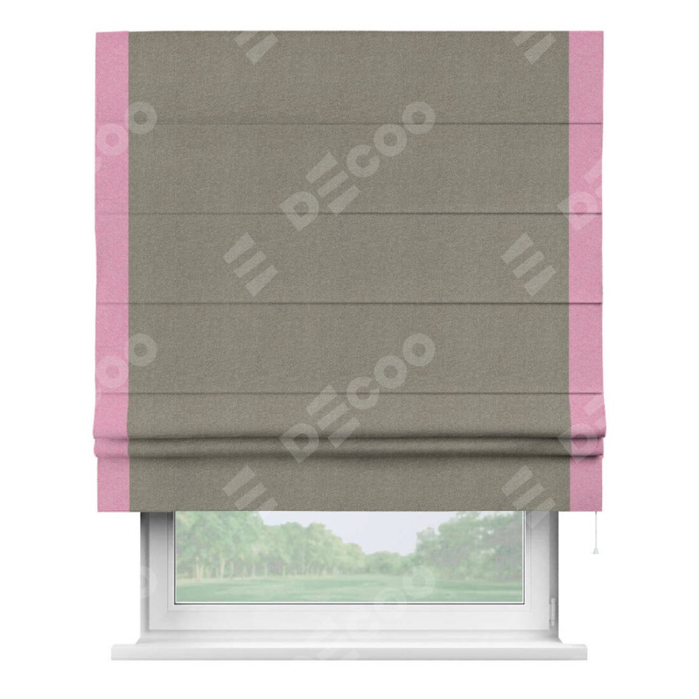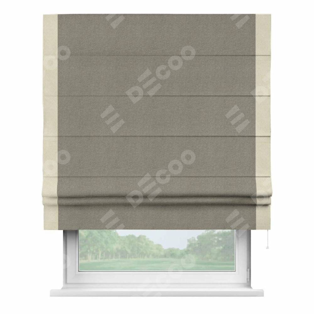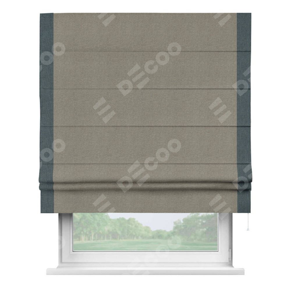 Римская штора производителя «Cortin», используется для проёма, пошита из ткани лён димаут cеро-зелёный, артикул 00003. Отделка шторы кантом «Стрим Дуо», ткань для канта используется из льна димаут разной расцветки на выбор. Имеет универсальный механизм и подходит для монтажа: на потолок, на стену и в нишу.