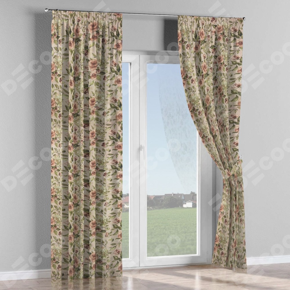 Комплект прямых штор, от производителя «Cortin», пошиты из ткани «Розы бежевые», артикул ткани 34564. С изнаночной стороны в верхней части штор пристрачивается шторная лента с декоративными складками «Карандаш». Для создания элегантных складок прямые шторы шьются по стандарту с коэффициентом 1:2 (на 100 см. ширины проёма 200 см. ширины ткани).