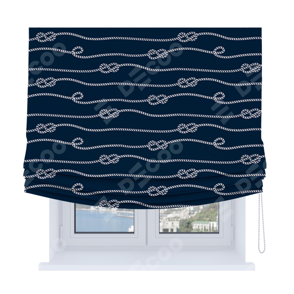 Римская штора Soft производителя «Cortin», используется для проёма, пошита из ткани блэкаут с нанесением сублимационной печати «Морской узел». Имеет универсальный механизм и подходит для монтажа: на потолок, на стену и в нишу. В отличие от стандартных римских штор, римская штора Soft не имеет горизонтальных вставок и нижнего отвеса. Это позволяет ткани произвольно драпироваться в свободные мягкие складки.