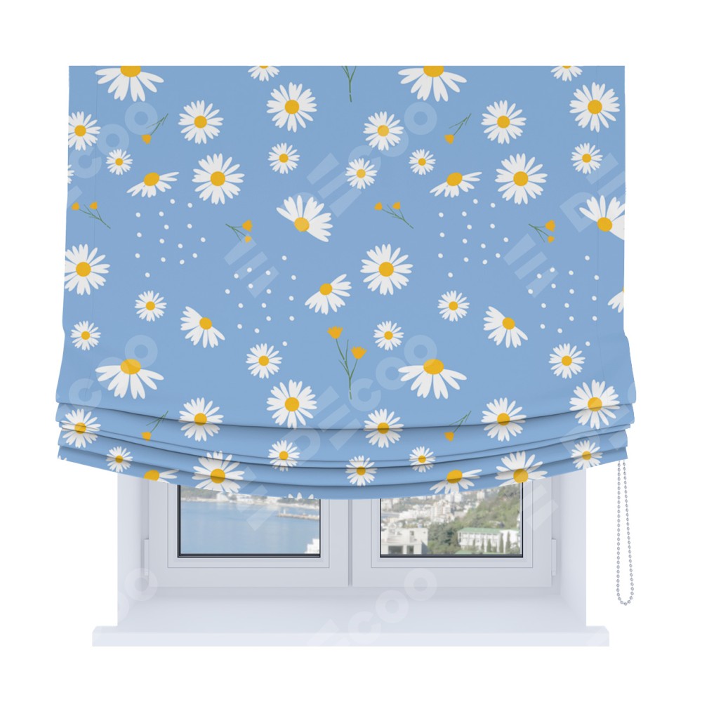 Римская штора Soft с мягкими складками, «Ромашки на голубом»